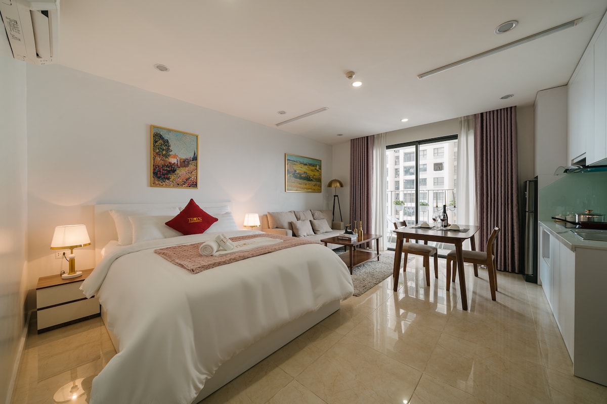 Hej solskin, dit 35 m2 studie er fuldt møbleret med privat badeværelse og tekøkken og balkon. Gratis hurtig og stabil wi-fi (250 Mbps download/upload-hastighed). Premium filtreret blødt vand til den mest følsomme hud. Drevet af solenergi. Stille beliggenhed, så du kan sove godt om natten. Gratis parkering på stedet. Gratis rengøring en gang om ugen. Fuldt tilgængelig med elevator i bygningen. Fitnesscenter på tagterrassen. Tæt på West Lake, berømt streetfood og nærbutikker. Kom til vores Eco nest i dag!