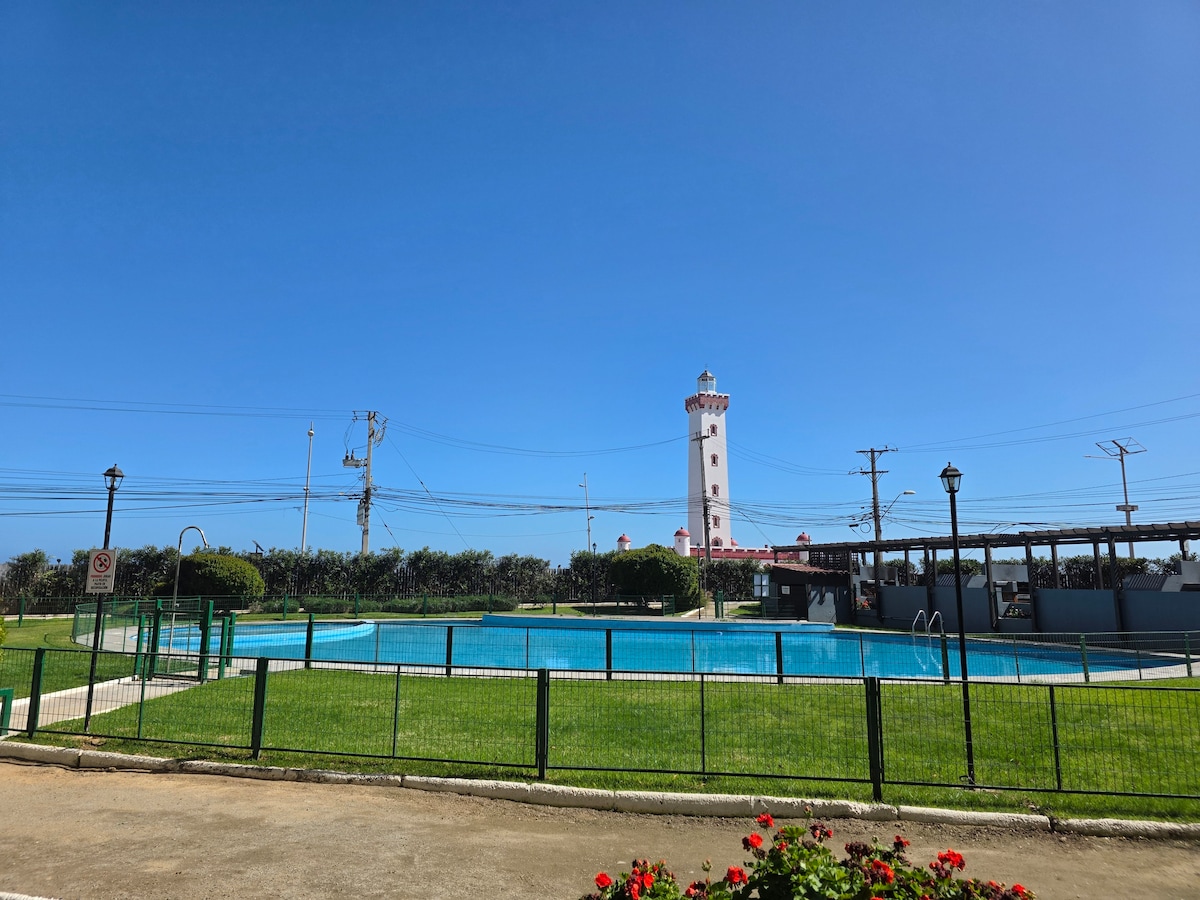 Smuk lejlighed på 8. etage med udsigt over den første linje bugt, få skridt fra Monumental Lighthouse of La Serena. Ejerlejligheden har quincho, 2 pools og vaskeri. Den består af soveværelse med eget badeværelse, andet soveværelse med Nest-seng og komplet badeværelse, stue - spisestue, tekøkken udstyret til 5 personer, wi-fi og kabel-tv. Terrasse med smuk havudsigt. Parkering, råd 24 timer i døgnet.