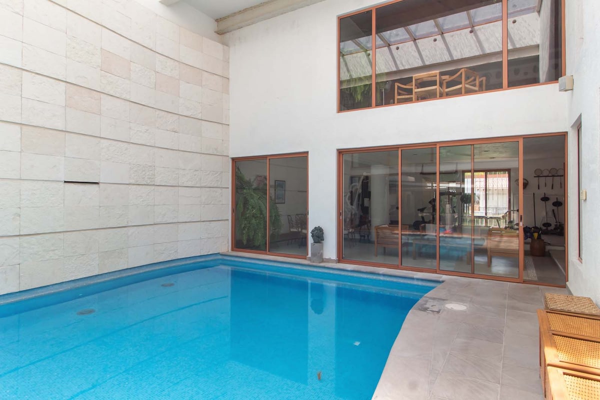 Increíble casa estilo colonial, estancia para 8 personas, cuenta con 4 recámaras (con 1 cama matrimonial cada una, mas sofá cama en 2 de ellas), 2 baños completos, cocina equipada, patio de servicio, sala, comedor, chimenea, asador, jardín, estacionamiento, alberca climatizada con celdas solares, tv y wi-fi. La mejor opción para nadar y disfrutar al aire libre sin entrar en contacto con más personas, cuenta con vigilancia dentro del fraccionamiento las 24 hr.
