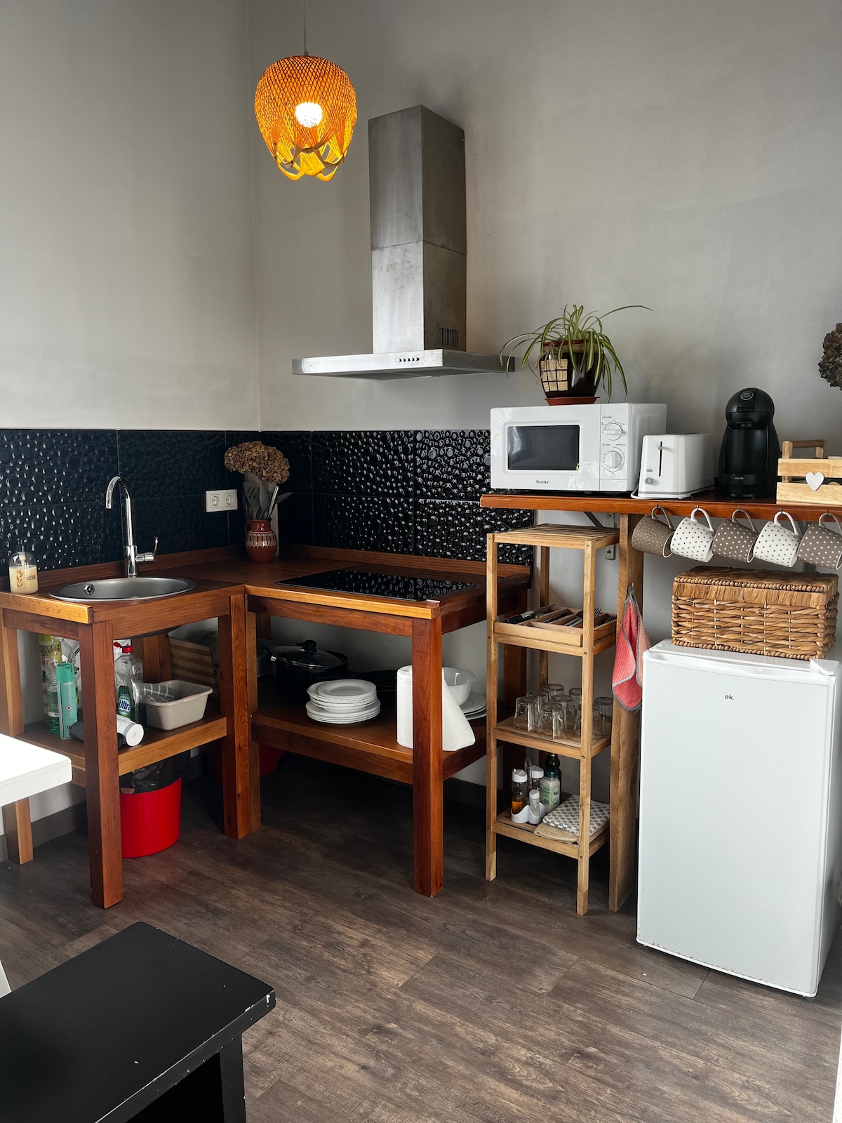 Etværelses lejlighed på 50 m2 med kingsize-seng og trægulve. Beliggende i stueetagen, kørestolsvenlig med egen indgang. Fuldt badeværelse udstyret med bruser, håndklæder, hårtørrer og toiletpapir. Køkkenområde: Køleskab, kaffemaskine, mikrobølgeovn, opvaskemaskine, komfur, brødrister Stue med sofa og fladskærms-tv. Varme. Privat terrasse med adgang til udendørs pools og have. Gratis udendørs parkering