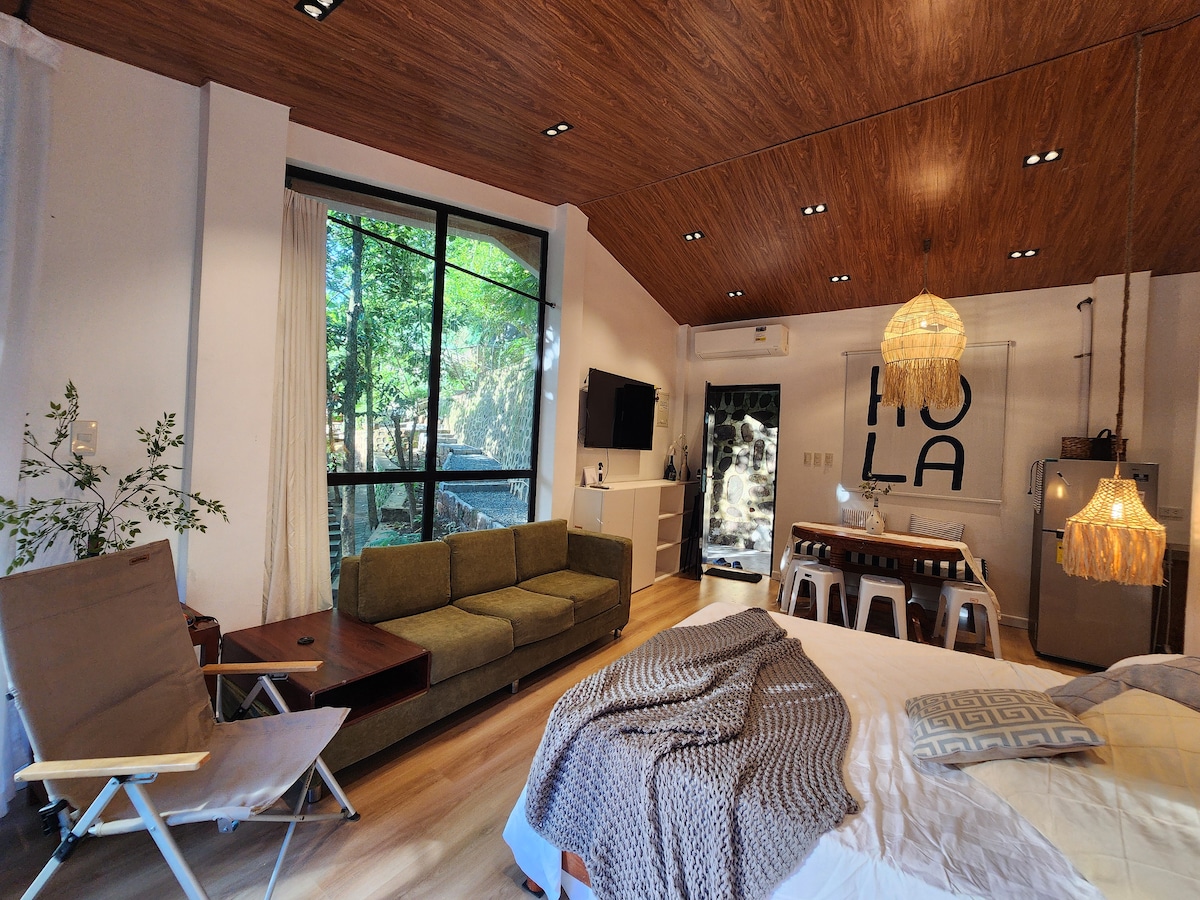 En hytte, hvor du og din familie og venner kan slappe af og få ny energi, mens du er i den travle by. Denne hytte har to værelser med aircondition, et badeværelse med hovedbruser og vandvarmer. Foran hytten er der et tilholdssted, hvor du kan nyde din kaffe, mens du arbejder på din bærbare computer.