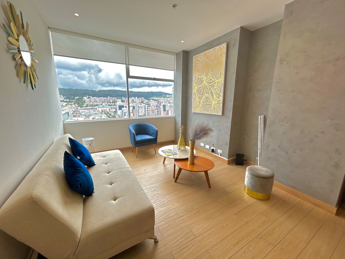 ¡Velkommen til vores eksklusive bolig i Quito i Ecuador! Vi inviterer dig til at fordybe dig i et miljø, der forener essensen af ecuadorianske Andesbjergene med den varme essens af den ecuadorianske kyst. Vores afdeling, der ligger i en moderne bygning i nærheden af "Parque La Carolina", i den nordlige del af byen, er en skat, der venter på dig. ¡Vi venter på, at du får en smuk oplevelse på vores Airbnb!