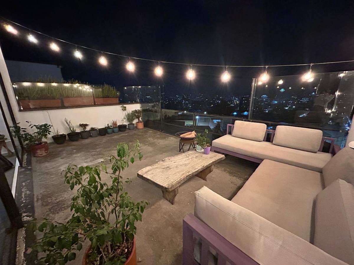 Dette sted er unikt og har sin egen minimalistiske stil, det har luksuriøse rum, hvis du ønsker at tilbringe en romantisk aften med din partner, har vi en privat jacuzzi, en fantastisk udsigt i de forskellige omgivelser, queensize seng, privat grillplads, pejs med Bluetooth-lydudstyr, Netlife internet, 65 tommer tv og Netflix, privat LG Smart tørretumbler, elektriske gardiner, sikker elektronisk adgang, beliggende i en af de bedste sektorer i Quito, fester eller kæledyr er ikke tilladt