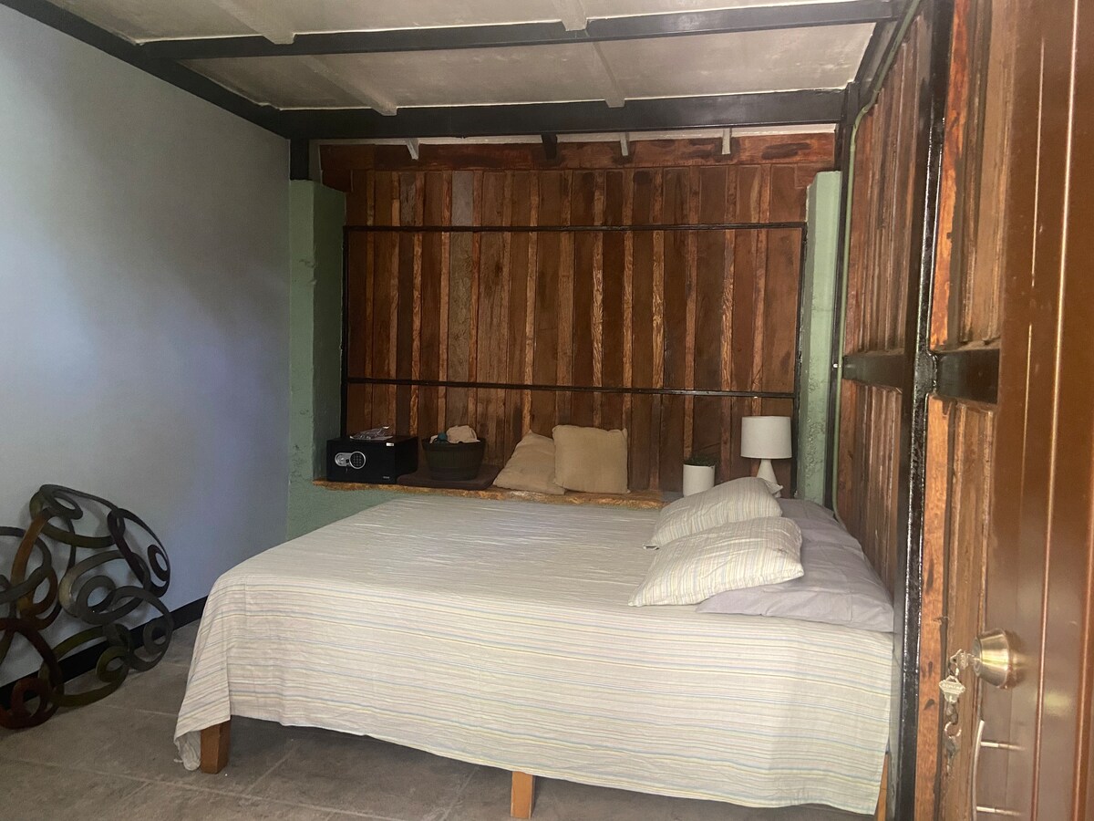 Nyd en dobbelt suite på en høj etage, helt lavet af træ, med komfortable senge, en balkon og en smuk udsigt over havet. Beliggende kun 20 skridt fra det paradisiske caribiske hav Mahahual. Værelset har eget badeværelse med varmt vand, aircondition, køleskabsbar og kaffemaskine. Vi har også en sikkerhedsboks og wi-fi i hele boligen.