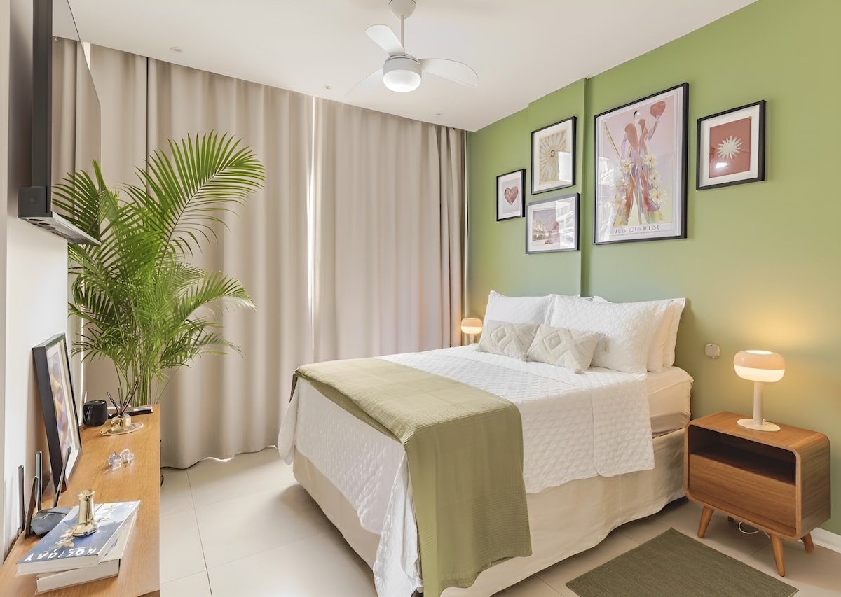 Læs husets 4 regler i afsnittet "Hvad du skal vide" og "Vis mere". Højdepunkter: - Daglig rengøring af lejligheden inkluderet - Nyrenoveret lejlighed med nye møbler - Bygningsinfrastruktur med swimmingpool, sauna, restaurant og fitnesscenter - Portner døgnet rundt - Adgangskodelås - Smart-TV i stuen - Højhastigheds-wifi - Plads til op til 3 personer, 1 på sofaen (anbefales til børn) - Køkken med alt udstyr - Ved siden af indkøbscentrene Leblon og Rio Design - 5 minutter til stranden