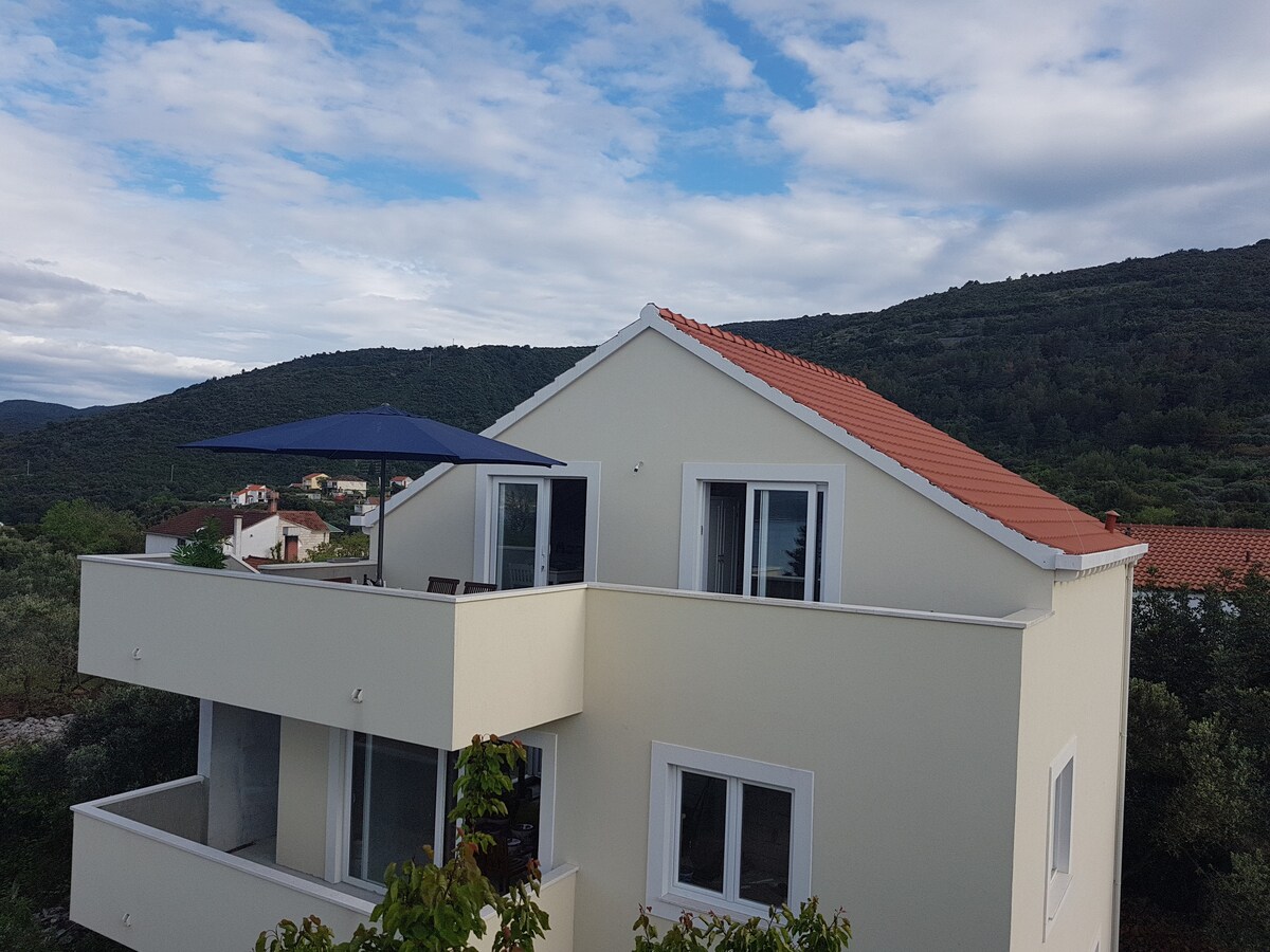 En ny lejlighed med en smuk udsigt over havet og den gamle bydel i Korcula. Lejlighedens område er 85 m2 og ligger kun 400 m fra den gamle bydel i Korcula. Det ligger for enden af en stille gade omgivet af en skov. Du behøver kun et par minutters gang til den gamle bydel,restaurant, havn,hav og butik.