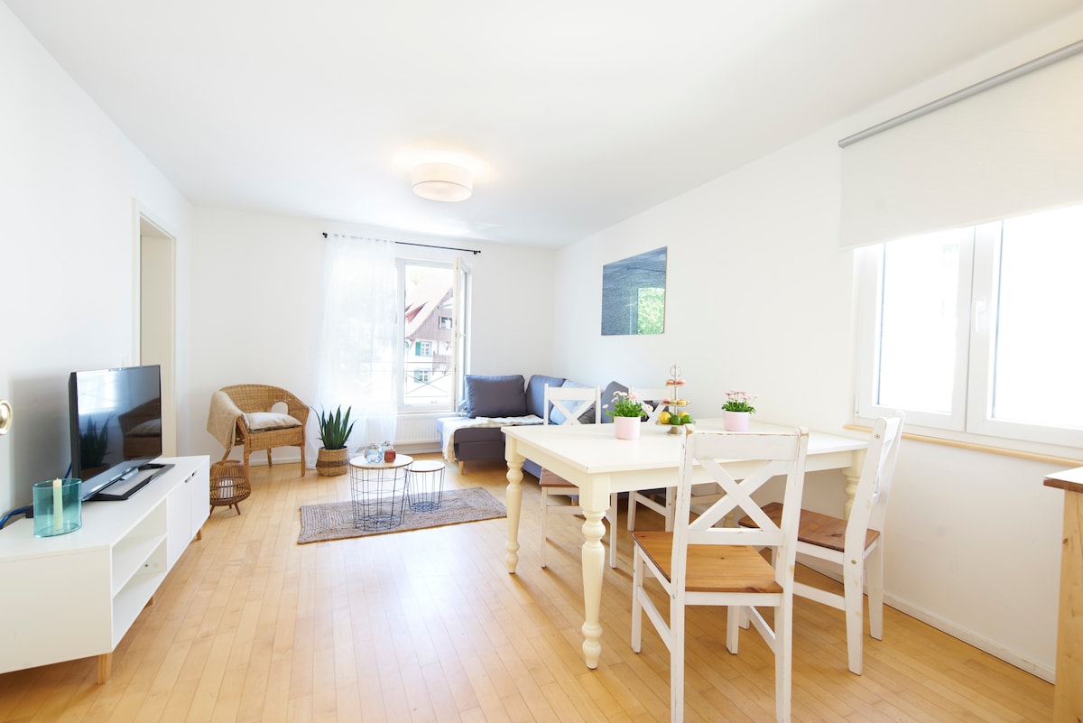 Den lyse, moderne og solrige boutiquelejlighed ligger i et roligt, grønt område i udkanten. Der er en terrasse, et lejrbålsområde og en legeplads. Forskellige seværdigheder, natur og Bodensøen inviterer dig til at opdage og slappe af. Lejligheden er ideel til par og familier. Offentlig transport (busstoppested, togstation) ligger i umiddelbar nærhed, og Bodensøen kan nås på 5 minutter i bil. At købe friske sæsonbestemte grøntsager fra vores egen gård.