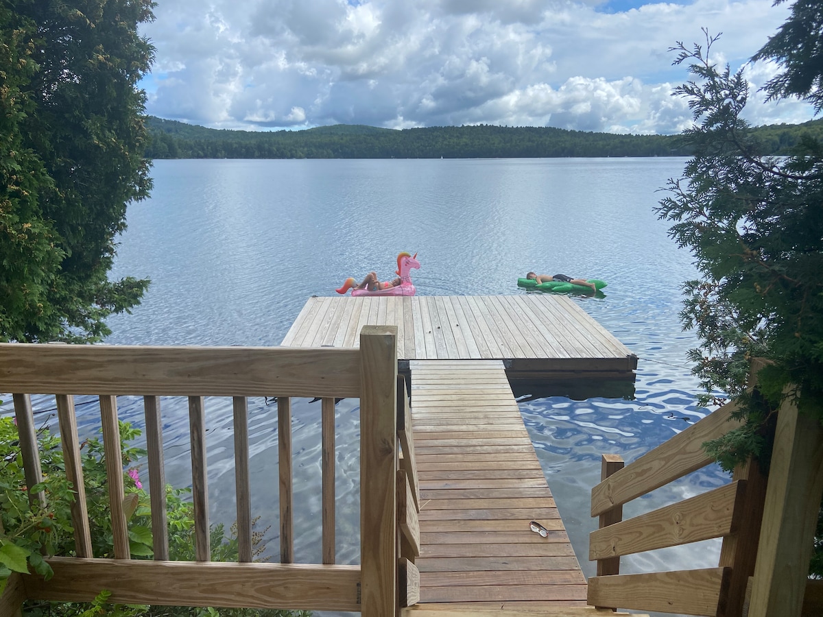 Our home has a beautiful waterfront location on Dodge pond with spectacular views & gorgeous sunsets. *Private Waterfront property. *Use of 2 Kayaks & 1 Canoe, floating Swim dock & separate dock for your boat or fishing [late June through Labor Day] *Bedroom 1- Queen Bed *Bedroom 2-Single bed & bunk beds [sleeps 3] * Easy access to public boat launch * We welcome 1 well behaved dog. *End of June through August, we rent Saturday to Saturday weekly.