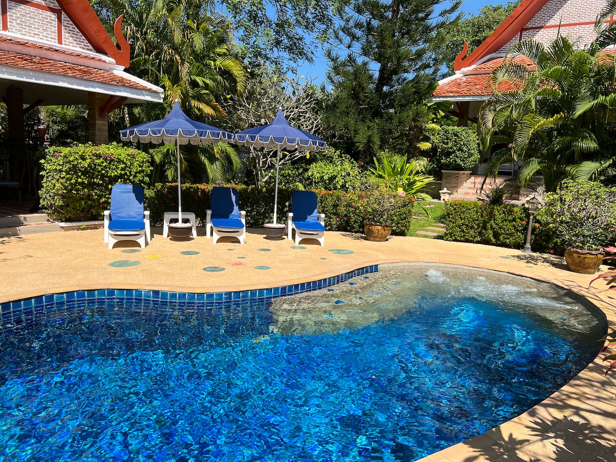 👫 Alan og Nuch inviterer dig til vores hjem; en rolig villa beliggende midt i en frodig tropisk have omkring vores store private swimmingpool. 🏡 Vores eneste separate gæstehus er smagfuldt indrettet i traditionel thailandsk stil, udstyret med luksuriøse faciliteter for et behageligt ophold, uden andre gæster på ejendommen end os. 📌 Vores beliggenhed er sikker og stille, men alligevel tæt på strande, restauranter, barer, butikker, seværdigheder med mere. ⚠️ Læs alle afsnit for vigtige oplysninger.