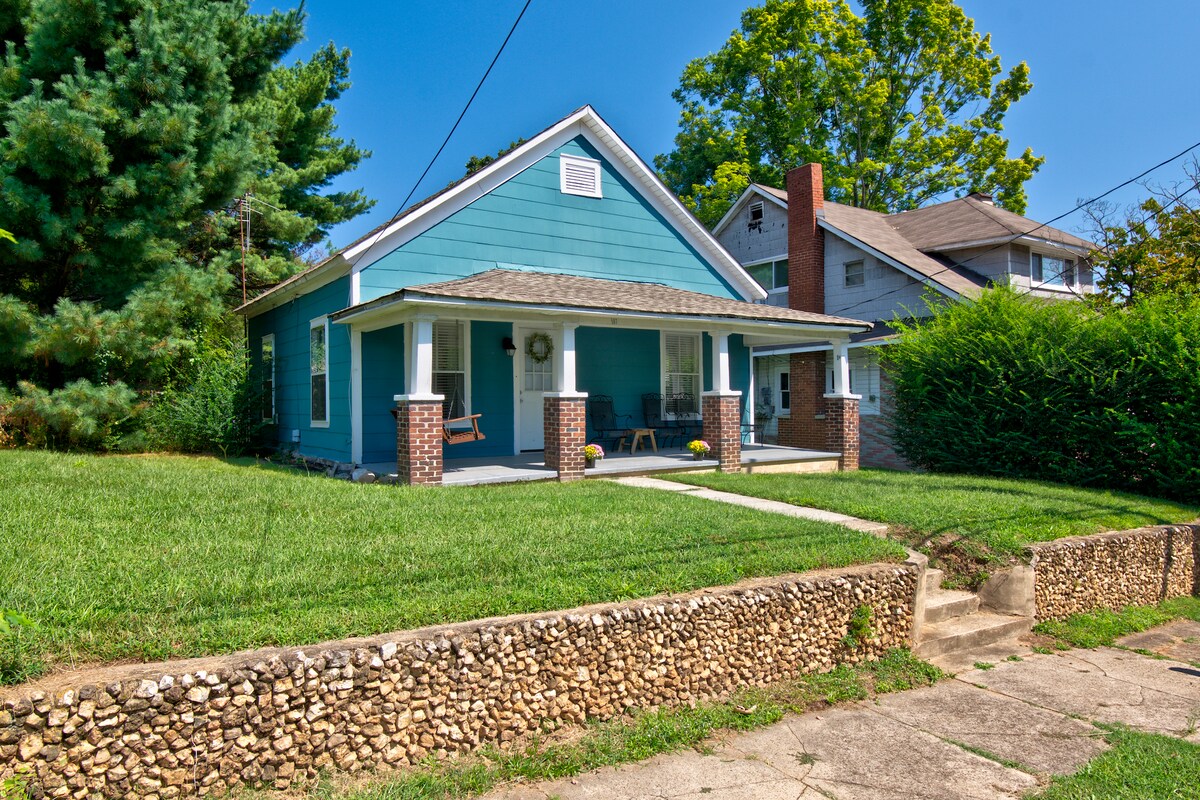 Velkommen til Chattanooga! Nyd en stilfuld, hyggelig oplevelse i denne centralt beliggende bolig. Gåafstand til NorthShore og restauranter og seværdigheder i Chattanooga centrum. Udsigt over den berømte Walnut Street Bridge og Chattanooga Aquarium fra verandaen. Slap af omkring bålet. Stor, helt indhegnet gård. Føl dig hjemme i denne hyggelige North Chattanooga-bungalow.