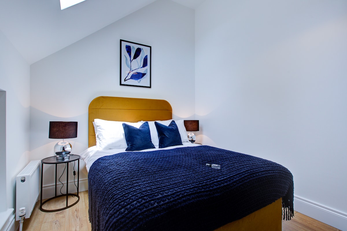 • 500 kvadratfod 3. sal 1 seng/1 badeværelse med højt til loftet • Børnevenlig med barneseng, høj stol, sikkerhedsgitter og legeplads i nærheden. • Senge: 1 Super King Foam-seng (180 cm bred), tre gulvmadrasser (64 cm) og en sofa. • Professionelt rengjort med 500TC sengetøj og alle tænkelige faciliteter. • WiFi (100 Mbps), smart-tv, højttaler, hårtørrer, Dyson-blæser, vaskemaskine og tørretumbler. • Andre muligheder: www.airbnb.co.uk/s/homes?host_id=1408974