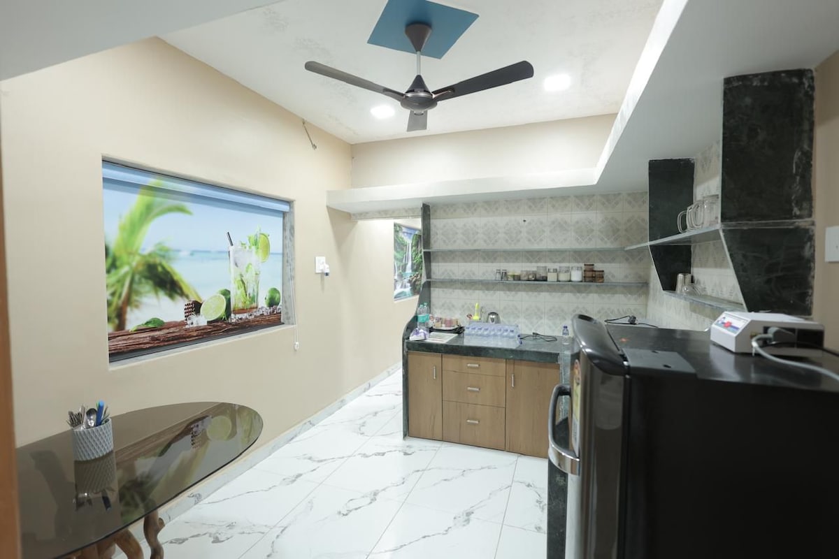 Helt separat hus med egen indgang. Ingen forstyrrelser fra nogen. Centralt beliggende, fredfyldt atmosfære, budgetfrit, 5 minutters gang til stranden. Sukker og te findes i køkkenet. *84**69 ## 082** $$ 819 Varmt og koldt vand døgnet rundt. vinbutik og dagligvarebutik i det omkringliggende område. Kæledyr: 700 Rs. ekstra betales på ejendommen. ville hjælpe med at få cykel på leje Renhed er vores motto. Beliggende i hovedbyen. De fleste turiststeder i nærområdet. BEMÆRK. ....Det er en selvbetjent lejlighed.