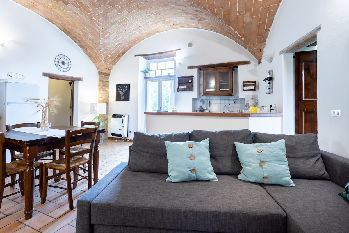 In 2023 my son Guglielmo and I decided to restore the old oratory of a church from the 1600s by creating a two floor apartment: upstairs we have 2 bedrooms equipped with AC and 2 en-suite bathrooms with shower; downstairs a spacious living room with stereo Available a table outside with great view and a nice garden 50 mt away where to have a private wine tasting or barbecue for all the guests of our 4 apartments, after 7pm if booked large in advance Large free parking area 100 mt away