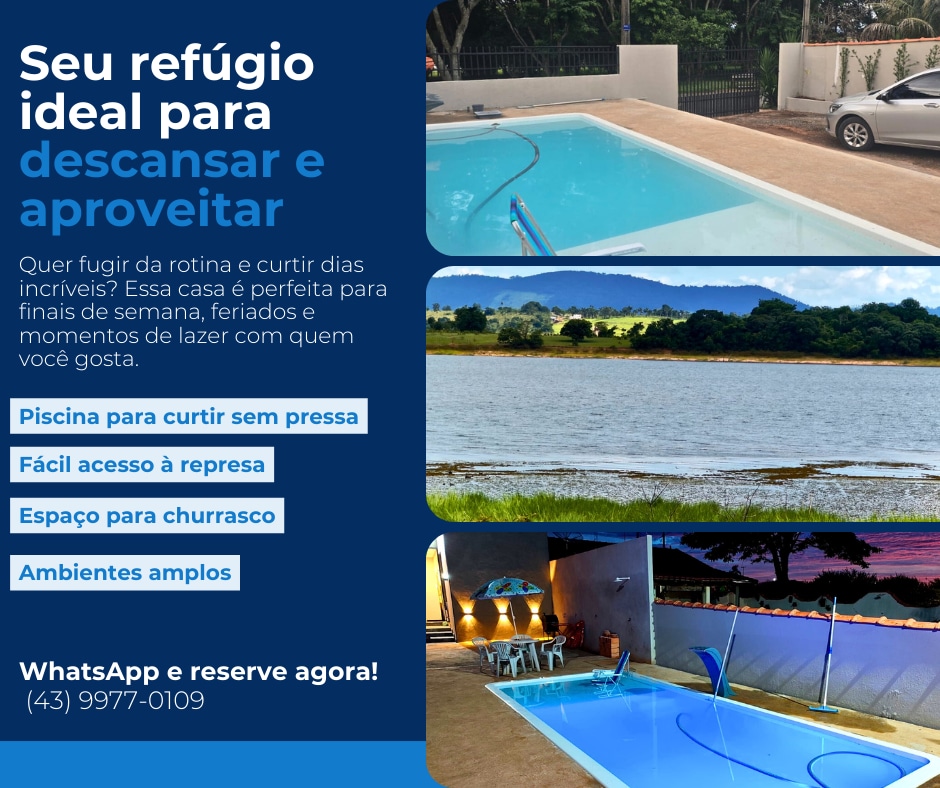Hus med swimmingpool i ejerlejligheden Enseada do Tucunaré i Carlópolis PR, 150 meter fra dæmningen. Lukket område 3 km fra byen! Huset indeholder 3 soveværelser, med to en-suiter, en med en dobbeltseng og en køjeseng og aircondition, og den anden med 1 dobbeltseng, en køjeseng og aircondition. tredje soveværelse med to køjesenge og ventilatorer!