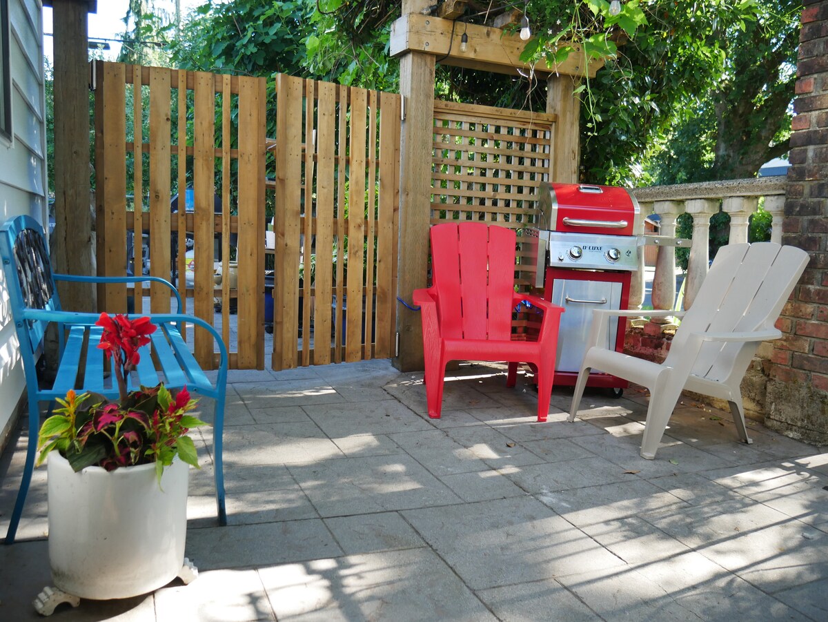 Vores rummelige 1200²ft hjem ligger i det legendariske Kitsilano og er et perfekt fristed for familier, grupper og forretningsrejsende. Få skridt fra offentlig transport, restauranter, caféer og markeder. Gå til stranden på 20 minutter, kør til UBC/Downtown på 10. Slap af med et brætspil, et bad eller damp. Nyd et fuldt udstyret køkken, udendørs grill, opvarmet spiseterrasse og minibar. Flere arbejdsområder til rådighed og et 65" 4K smart-tv med 5.1 surround sound. Provinsregistrering til korttidsudlejning: H461111512