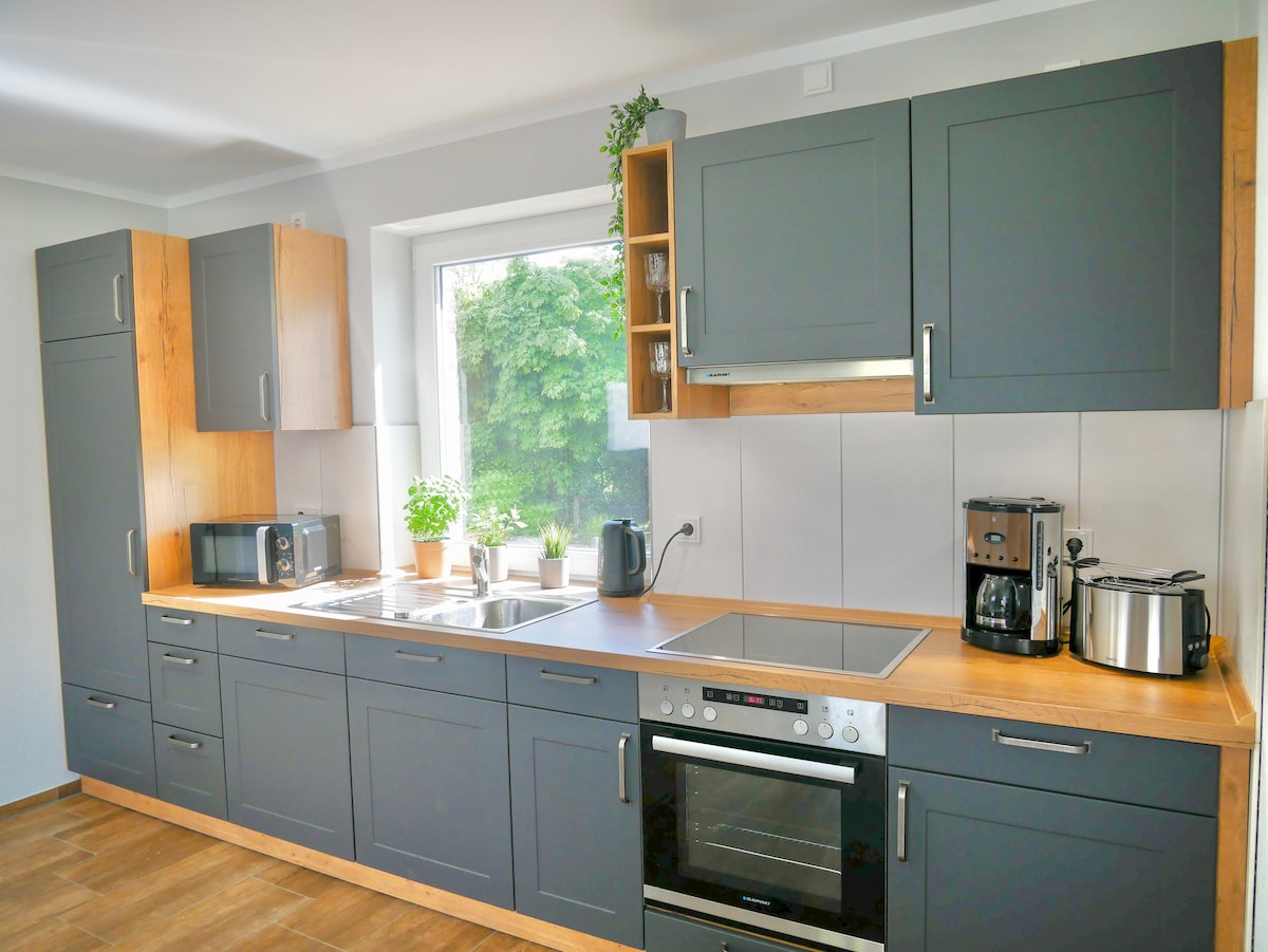 I bydelen Gartenstadt finder du vores nyrenoverede, højkvalitetsindrettede 75 m² ferielejlighed. Badeværelse med åben bruser og opbevaringsrum, stue-spisestue og køkken, der er indbygget efter mål. I det hyggelige soveværelse inviterer en boxspring-seng og en sovesofa dig til at slappe af. Der er også gæstetoilet og garderobe. Lejligheden er fuldt udstyret med elektriske persienner. Smart TV (55 tommer) med kabelforbindelse og Netflix til rådighed.
