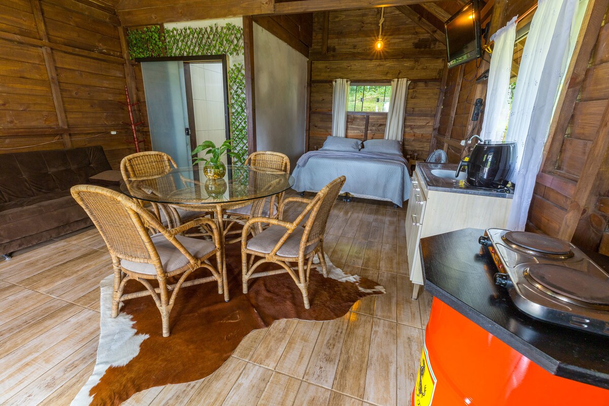 Hyggeligt Chalé, hvor naturen er din nærmeste nabo! Nyd total privatliv i denne rustikke ferie, der er designet i alle detaljer for komfort og ro. Fuldt udstyret, det har et soveværelse med dobbeltseng og et andet soveværelse med dobbeltseng + køjeseng, ideel til at tage med familie eller venner. Nyd også vores udendørs område, der er udstyret med grill, brændeovn og en hyggelig pejs, der er ideel til hyggelige nætter under stjernerne.