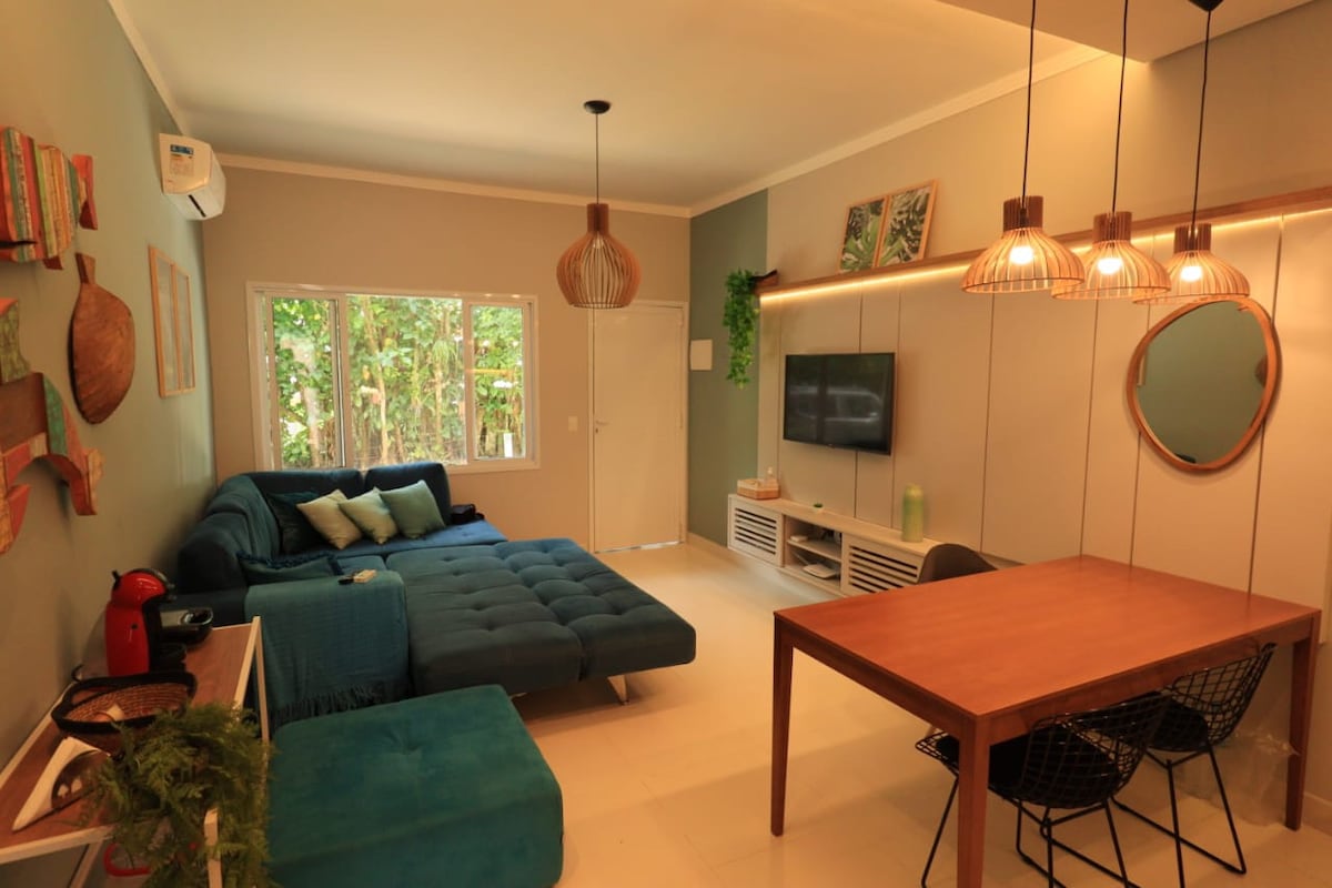 New high standard apartment, decorated and cozy, with a privileged location in the center of Juquehy on Shopping Monjolo street, being possible to do everything on foot. Gated community. Three spaces, large living room with Gourmet Kitchen, two bedrooms, one suite, 2WC, Air Conditioning in all environments, Wi-Fi, Smart TV, Brewery, Barbecue, Air fryier, Laundry, Dishwasher... Two Double Beds, Two Single Beds (Bunk). Bedding not included.