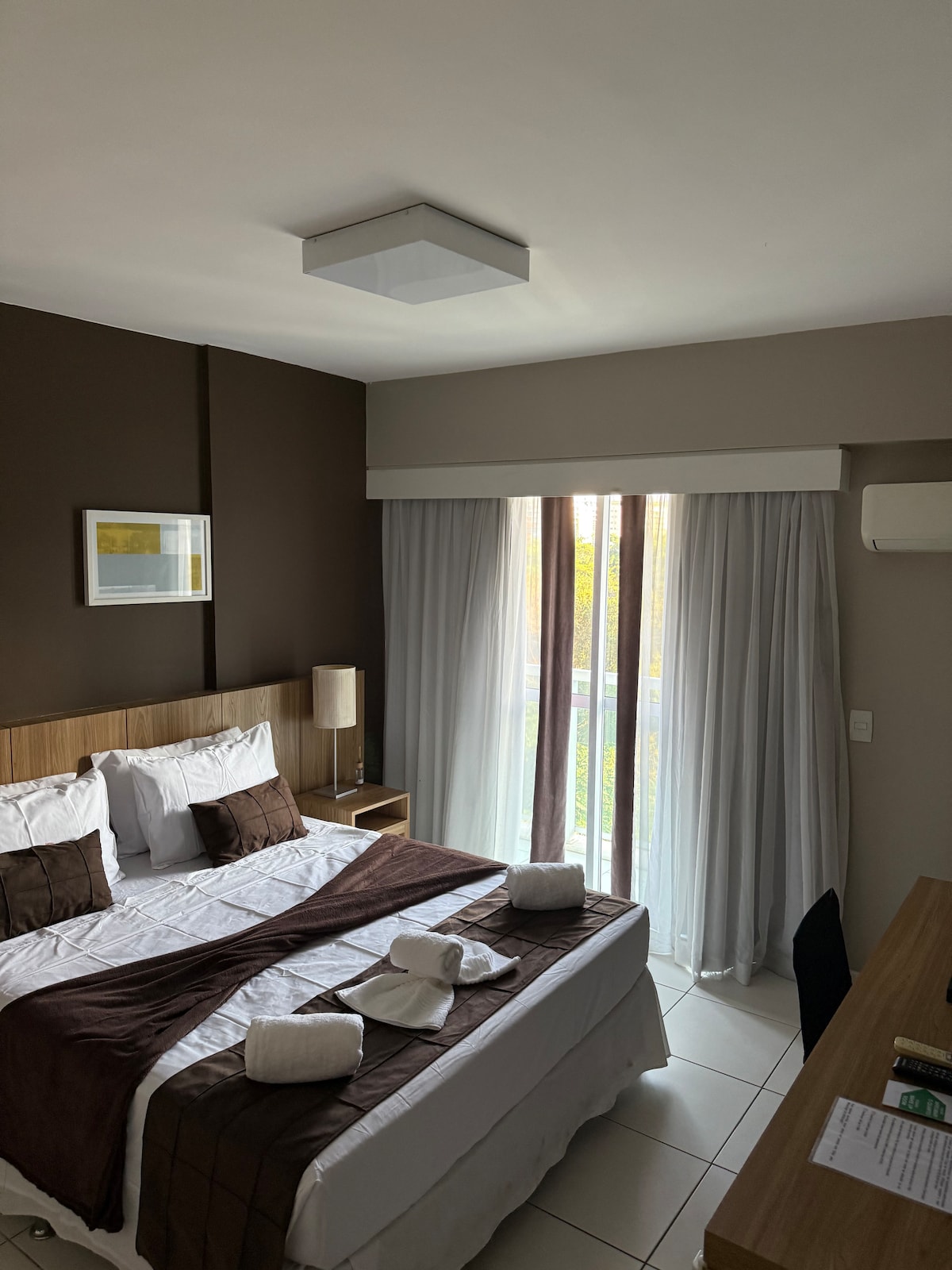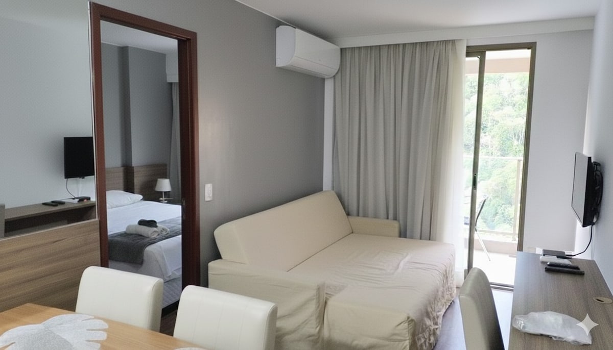 Moderne og hyggelig lejlighed, der kombinerer komforten af et hotel med friheden af et hjem. Logiet er ideelt til både fritids- og forretningsrejsende og har en suite med en queensize-dobbeltseng, aircondition, wi-fi, tv og minibar. Lejligheden tilbyder fremragende infrastruktur: fitnesscenter, swimmingpool, sauna, jacuzzi og restaurant med overkommelige priser. Beliggenheden er privilegeret, kun 100 meter fra RioCentro, hvilket sikrer praktisk og nem adgang til flere attraktioner i Barra da Tijuca.