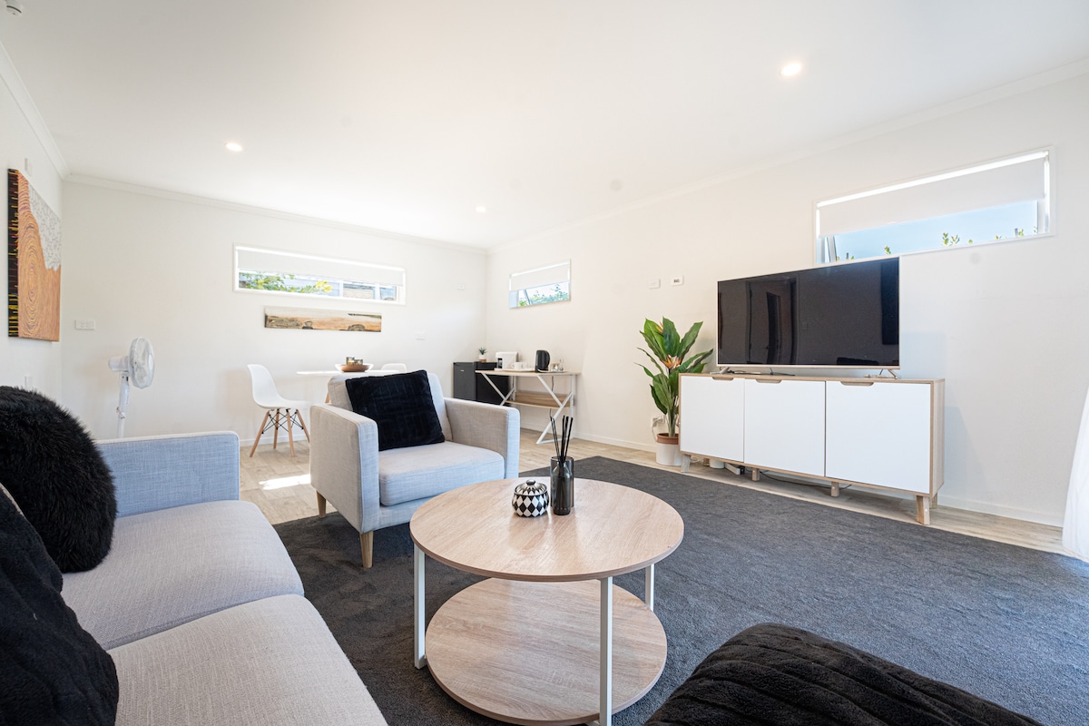 Step into this cosy, stylish studio tucked away in native bush. Close the door and switch off from the world… except for the gentle sounds of local birdlife, fantails, tūī and kererū Start your day with a coffee or wind down with a glass of wine on your private deck. Kick back on the couch with a good book or catch up on your favourite shows — this space is all about relaxing your way. Your peaceful getaway, designed with calm in mind. Plus, safe off-street parking for two vehicles.