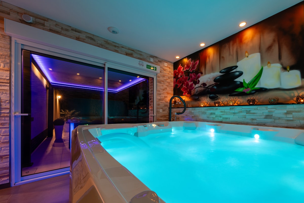 Et PRIVAT SOVEVÆRELSE/SPAOMRÅDE, DER er designet til optimal afslapning. Adgang og privat parkering ude af syne i 100 % naturlige omgivelser🌿 Til din rådighed; TV, soundbar, poledance-bar, køleskab, Senseo, mikrobølgeovn, små tallerkener, glas. For ikke at nævne den rummelige jacuzzi og det italienske brusebad!💦 Der er håndklæder og badekåber Samt morgenmad😋 Leje per nat fra kl. 19.00 til kl. 11.00 Kun for voksne🔞 Op til to personer Indtjekning og udtjekning uden vært med nøgleboks