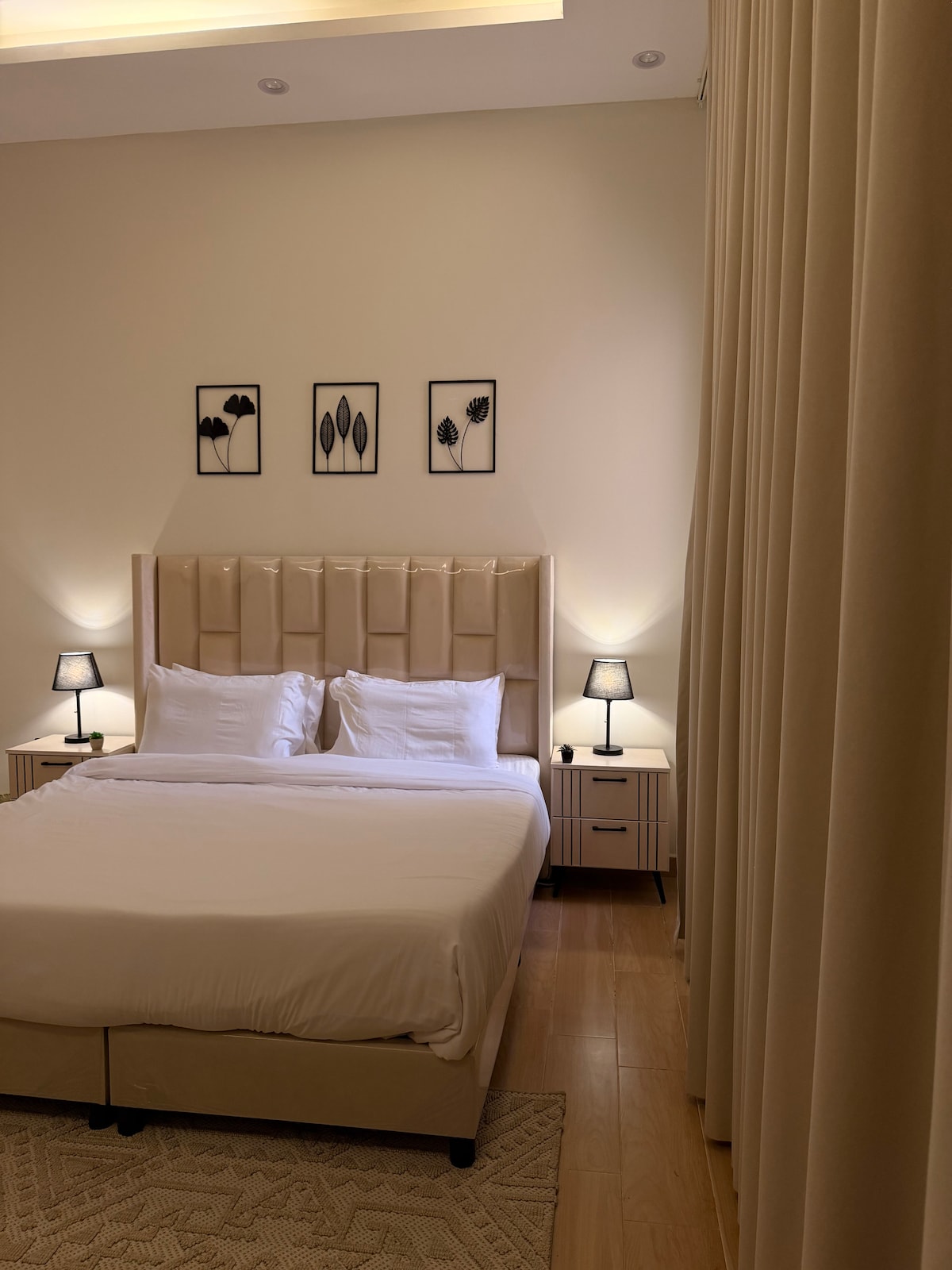 Luxury Apartment with Self-Entry consisting of a bedroom, living room, kitchen, and a fully equipped bathroom (shampoo, slippers, one-time use towels, tissues). • Stunning Boulevard view in Hittin, North Riyadh… The location is ideal, close to major events such as Riyadh Season, Diriyah Season, and all essential services like restaurants and shopping. Specifically: -Boulevard City 1 minute walking -Boulevard World 7 minutes walking -Arena Stadium 8 minutes walking -KAFD 12 minutes driving