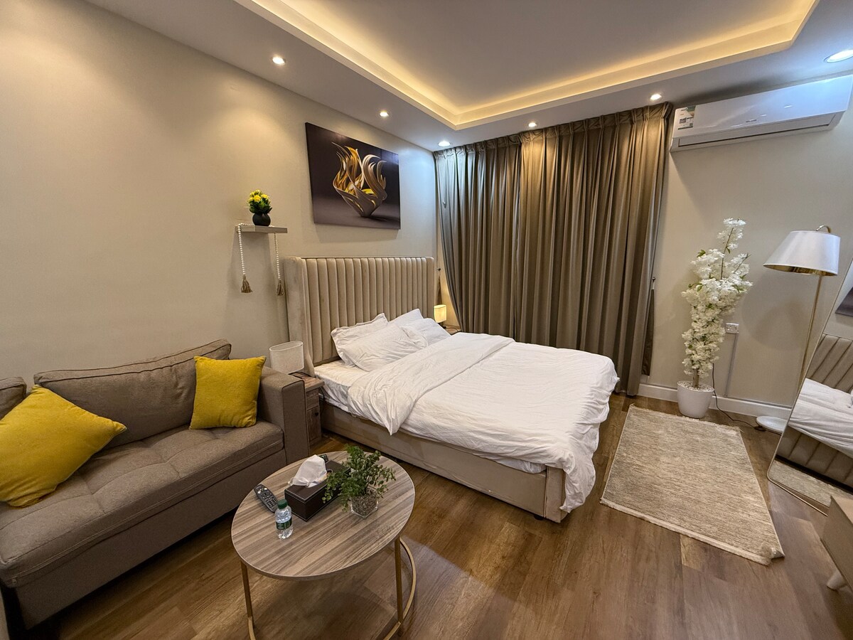 Apartment consists spacious bedroom with double bed, romantic side corner, a lounge with 2 people sleep bed for guests with 2 people sleep bed for guests with 2 people and relaxation, a 4K smart screen suitable for following movies and toys, an integrated kitchen with a washing machine, a dryer for clothes, a full coffee corner, a refrigerator, a dining table, an electric oven, a clothes cooker and all the necessary tools for the kitchen. Internetdækning er tilgængelig i hele lejligheden, og i alt 4 gæster i lejligheden Tæt på de vigtigste vartegn i Riyadh 22 minutter fra King Khalid Lufthavn 18 minutter fra Riyadh Boulevard