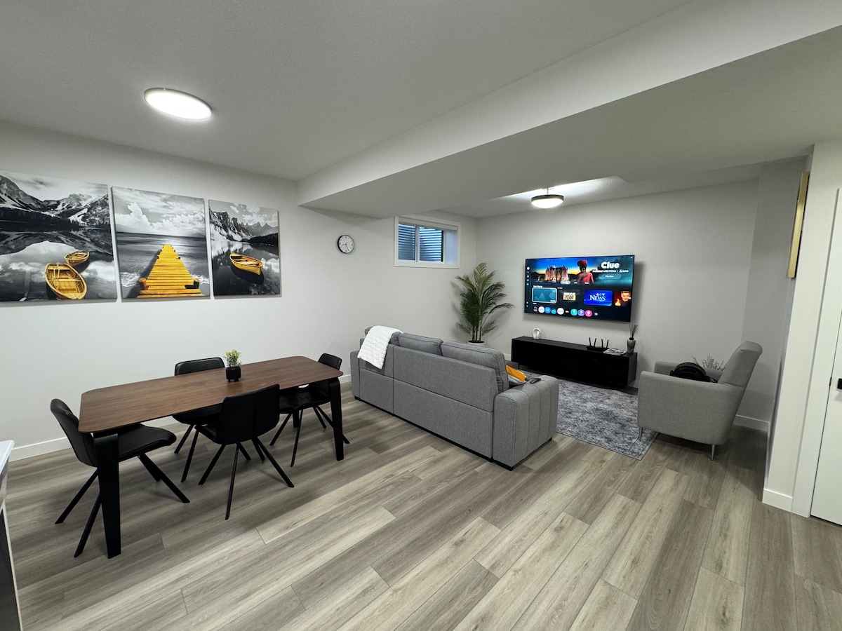Spacious and modern 2BR basement suite in Calgary, comfortably hosting up to 6 guests. Enjoy a private entrance, free parking, and a thoughtfully designed space for relaxing or working. Includes a well-equipped kitchenette, dedicated workspace with fast Wi-Fi, and a cozy electric fireplace. Just a 7-minute walk to the C-Train for easy city access, with Banff and the Rockies within a scenic drive. Perfect for families, business travelers, and mountain getaways.