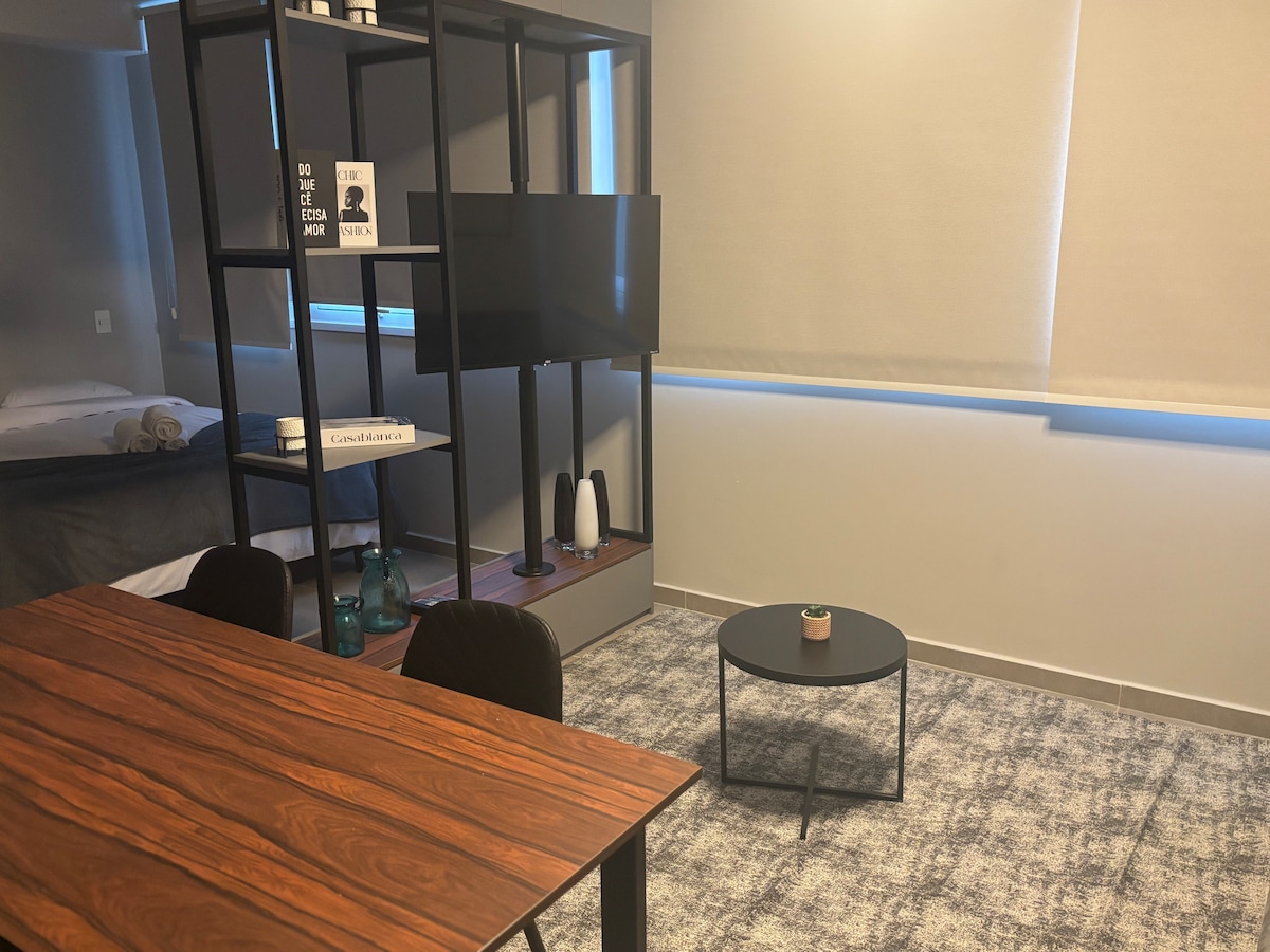 1 soveværelse (STUDIOLEJLIGHED) med eget badeværelse + stue +balkon med udsigt ( 1 udlejning) - Kompakt og køligt loft, fuldt møbleret og smagfuldt. Planlagte skabe ( køkken, badeværelse, soveværelse og stue) sofa, køkkenbordplade, stole, boks seng, standard dobbeltseng (komfortabel), gardiner, boks bandeiro + spejle, køleskab, komfur, Samsung Split aircondition, vedhæng lysarmaturer og 47"tv-støtte. God til par og forretningsrejsende. Fantastisk beliggenhed med barer og gastronomi.