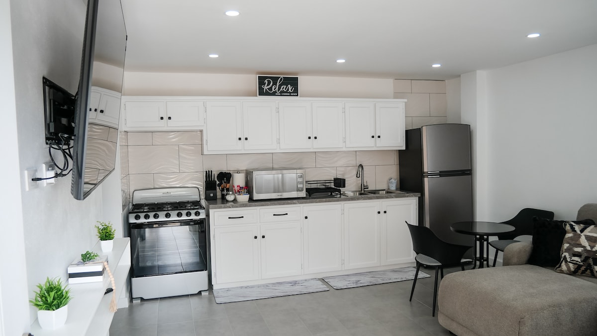 Vi byder folk af alle racer og køn velkommen. Kom og bo godt på ferie eller forretning. Denne fuldt møblerede luksusbyder på en rolig oplevelse i en ideel beliggenhed med nærhed til strande, restauranter, indkøbscentre, tankstationer og natteliv. Den indhegnede ejendom har en elektronisk port, parkeringsplads, sikkerhedskameraer og en venlig, opmærksom Schæferhund. Har du brug for daglig cardio? Adgang til dette rum er op ad 2 trapper, som det ses på billeder. Bare reserver de datoer!