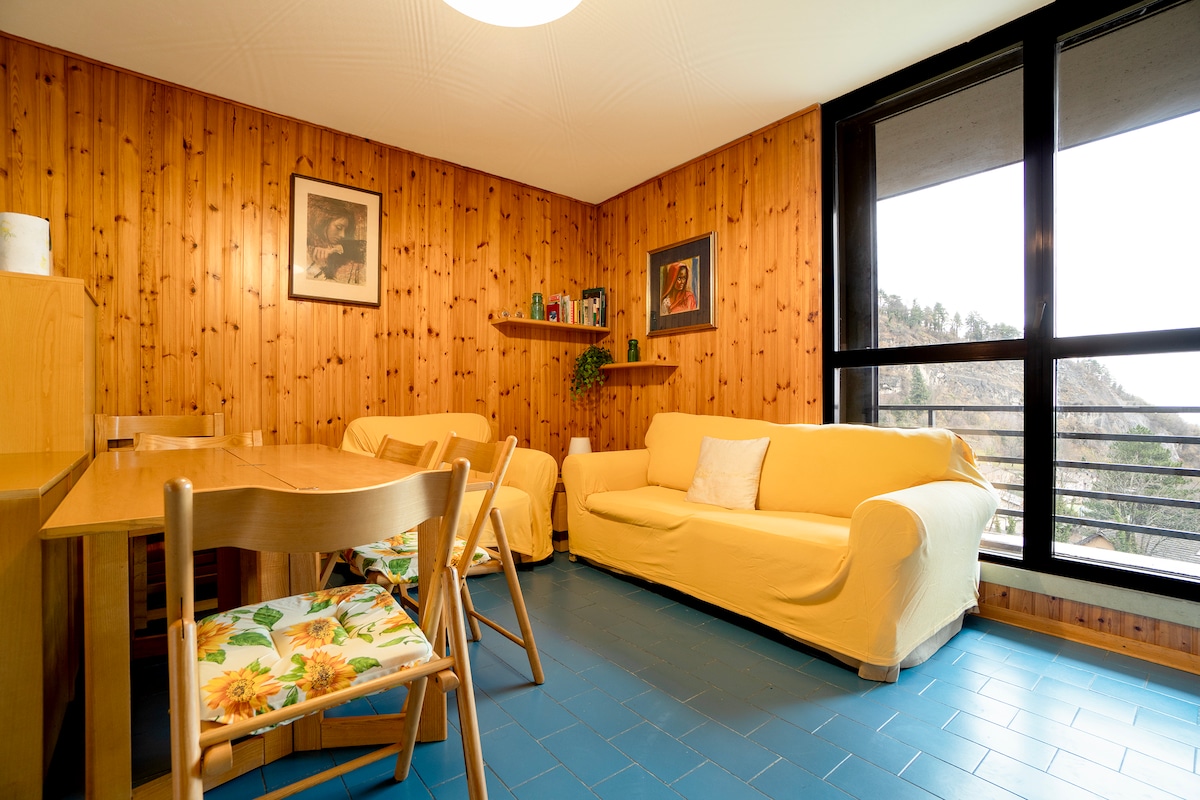 Bilocale con giardino pavimentato privato. Ingresso su soggiorno con camino con inserto, divano e TV, cucina con lavatrice, bollitore, tostapane, macchina del caffè, forno elettrico, lavastoviglie. Camera con letto matrimoniale e letto a castello. Giardino pavimentato attrezzato: sdraio, ombrellone, tavolo e sedie. Bagno con finestra e doccia. Comodo parcheggio a fianco. Vicino al palazzetto dello sport, minigolf, ai campi da tennis, al centro storico e alla seggiovia per Pian del falco.