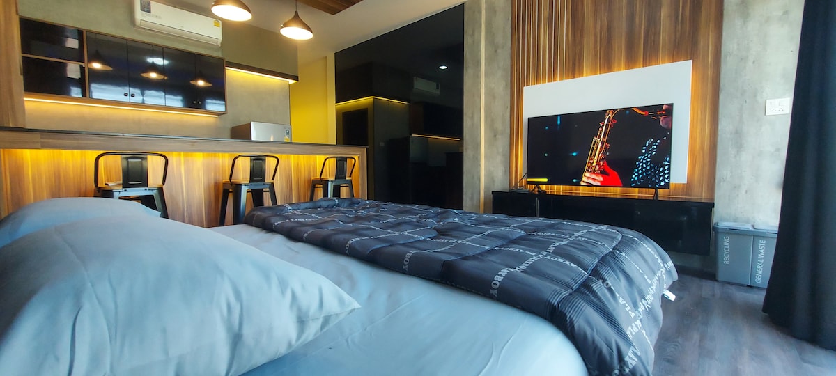 Et stilfuldt lejlighedsrum med separate opholds- og soveområder, en komfortabel seng, en sovesofa til en ekstra gæst. Vores bolig er perfekt til par eller små familier. Nyd den hyggelige stue med et dedikeret spiseområde. Få adgang til fælles faciliteter af høj kvalitet såsom fitnesscenter, pool og et kontorfællesskab, der skaber en atmosfære, der gør livet godt. Derudover kan du udnytte vores bekvemme beliggenhed inden for gåafstand til det største indkøbscenter i Chiang Rai.