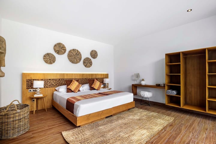 Naturlig charme: Vores villaer omfavner Balis tropiske skønhed, hvor lyden af naturgeækoer og insekter skaber en fredfyldt atmosfære. Det åbne design kan lejlighedsvis byde dyreliv velkommen på trods af regelmæssig skadedyrsbekæmpelse. Gekkoer, symboler på held og lykke i balinesisk kultur og andre dyr er afgørende for økosystemet.