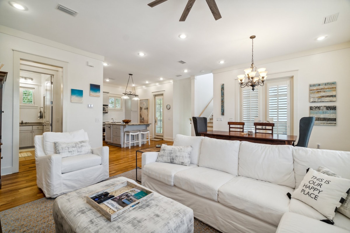 Søgningen stopper her! Vi fandt den bedste beliggenhed på 30A, så du ikke behøver at gøre det. Velkommen til Blue Skies strandferie. Parker din bil, og gå til det bedste, 30A har at byde på. Nyd den femstjernede pool i resortstil, som hele byen taler om. Gå til gode restauranter, smukke smaragdgrønne kyststrande og smukke downtown Rosemary. Tag på cykeltur ned ad en natursti, paddleboard på de sjældne kystklitsøer, oplev livemusik, besøg en statspark, fisk, se seværdigheder og shop.