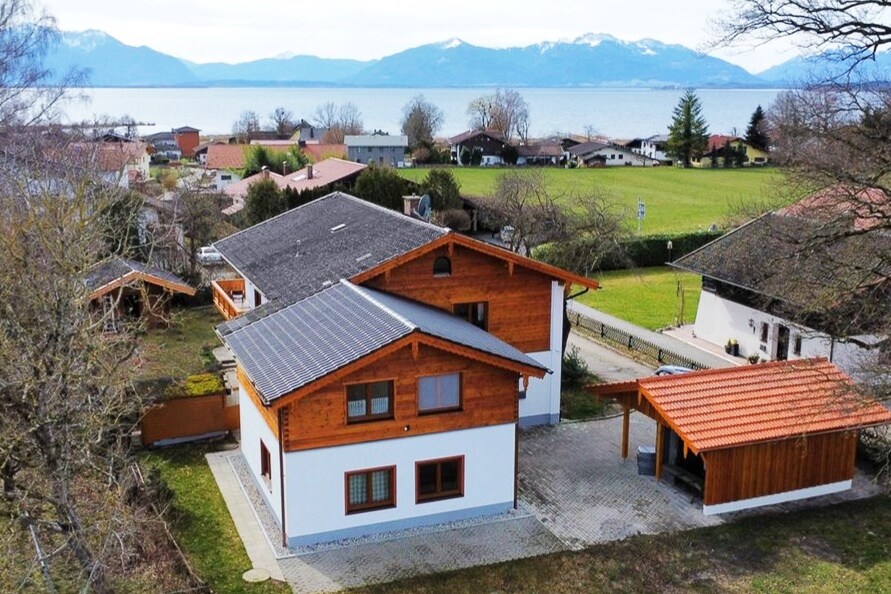 NYT! Moderne 5-værelses lejlighed med en unik udsigt over Lake Chiemsee og bjergene. Nyd natten i 4 rummelige soveværelser og dagen med din familie og/eller venner i den moderne stue og spisestue og på den store altanterrasse. Du kan parkere dine biler og cykler sikkert og gratis på ejendommen til dine udflugter i de smukke omgivelser. Blot et par minutters gang til søen og byens centrum - et perfekt udgangspunkt for dine udflugter.