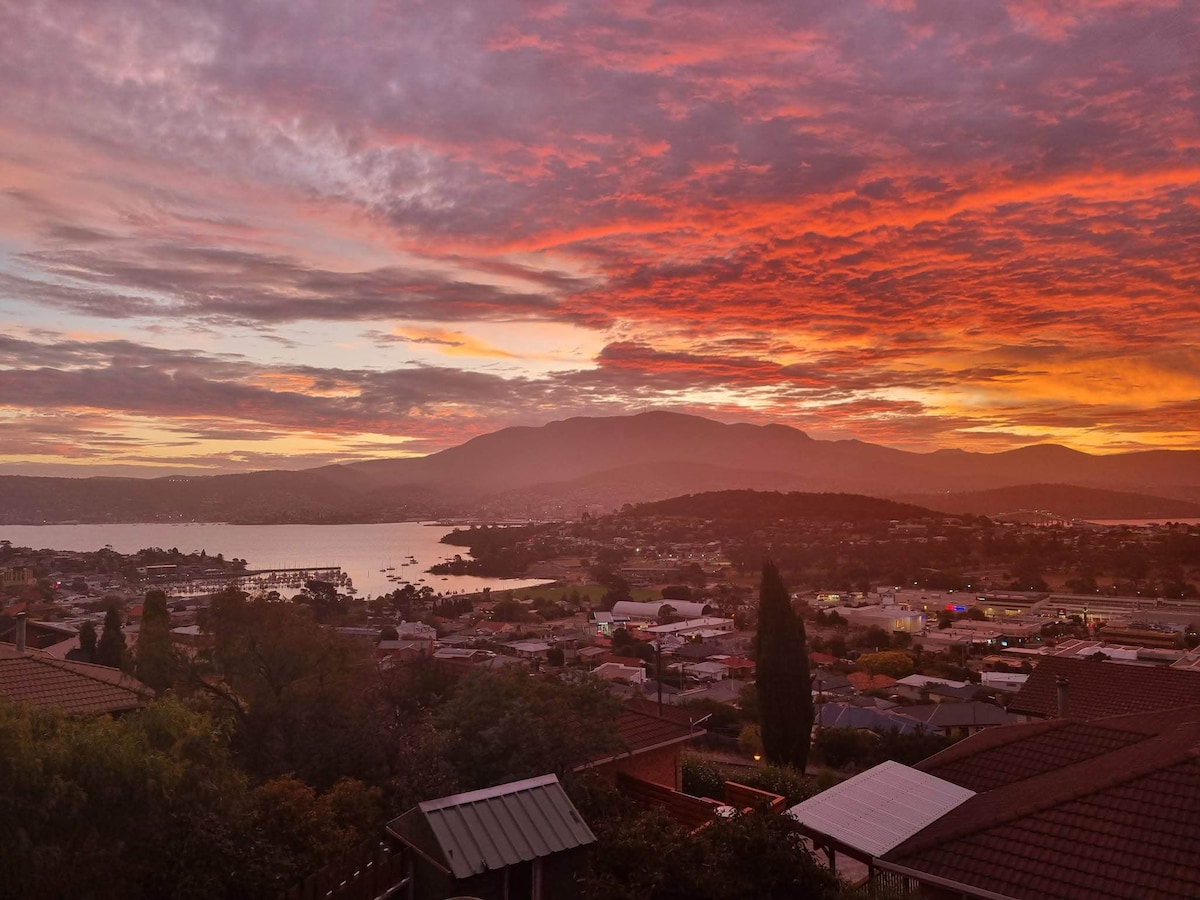 Smuk udsigt over floden, bjerget og marinaen fra et rummeligt, rent og lyst hjem på solrig østlige side af Derwent River. Meget hyggeligt med varme i alle rum! Gratis WIFI og Smart TV. Praktisk beliggenhed med motorvejsadgang til Hobart CBD på 6 minutter og lufthavnen på 12 minutter. Butikker og restauranter i nærheden og et fuldt udstyret køkken til nem feriemadlavning. Afslappende gåture ved floden og legepladser rundt om hjørnet. Nem indtjekning uden vært og gratis parkering uden for gaden.