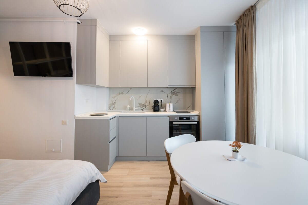 Oplev charmen ved vores urbane loftslejlighed i hjertet af byen! Nyd freden i vores elegante soveværelse med brede vinduer, der fylder rummet med sollys, og nyd et luksuriøst marmorbadeværelse. Denne indbydende bolig ligger i et dejligt kvarter og har et fuldt udstyret køkken, en afslappende stue og en lille balkon. Perfekt til den moderne rejsende, der værdsætter stil og komfort. Book dit ophold – nyd den enkle luksus, og gør dette loft til dit personlige skjulested.