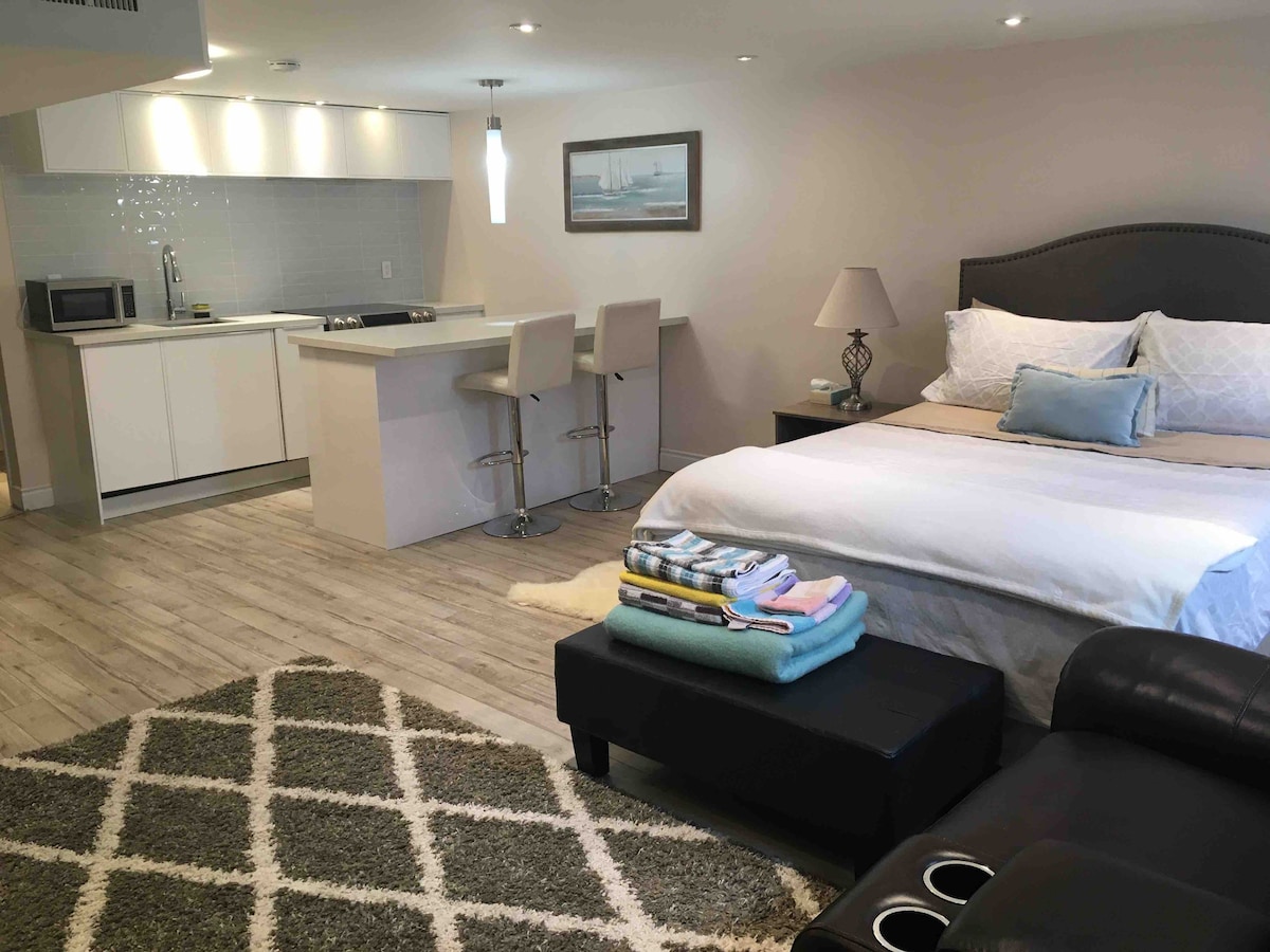 Komfortabel, fuldt renoveret lejlighedssuite i nederste etage af vores hus. Beliggende i et roligt malerisk område ved siden af Lake Ontario. Kort gåtur til søen og parkerne. Fantastisk til par, solo eller forretningsrejsende. 5 minutters gang til søen, 5 minutters gang til købmand og apotek. 30 minutters kørsel til Downtown Toronto og 40 minutters kørsel til Pearson Lufthavn. Nem adgang til Highway 401 og offentlig transport.