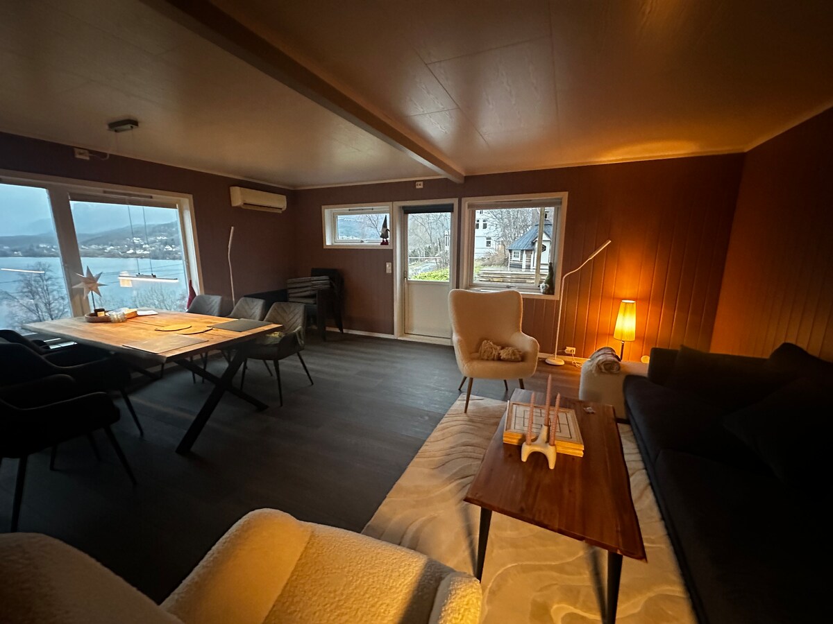 Glem bekymringene dine på dette romslige og fredelige stedet. Dejlig udsigt over søen og bjergene. Vi er kendt for at passe meget godt på vores gæster. Vi kan hjælpe dig med at finde rejser, der passer til dine færdigheder, og altid sørge for, at gæsterne får et optimalt ophold. Lejligheden er moderne og smagfuldt indrettet med store vinduer og skydedør i glas til udendørs område. Vi bor på en næse i Lyngenfjorden, og omgivelserne er smukke.