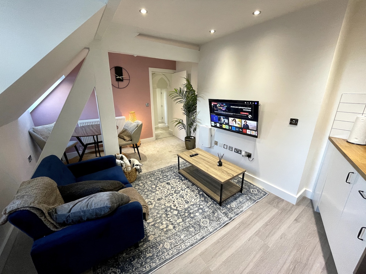 Et stilfuldt loft i centrum med synlige bjælker, luksusteknologi og unikke detaljer. Nyd et 55" Sky Glass-tv med fuld Sky, Netflix og mere, en 27" 5K iMac-arbejdsstation og en slikbutik for alle aldre. Plads til op til 5 personer med komfortable senge, fuldt udstyret køkken, nyt badeværelse og hurtig wi-fi. Gå til butikker, restauranter og seværdigheder. Parkeringsplads 30 sekunder væk. Anden sal (kun trapper). Indtjekning uden vært. Livligt område – folk, der sover let, vil høre byens lyde. Kontrol under opholdet gælder for ophold på over tre nætter.