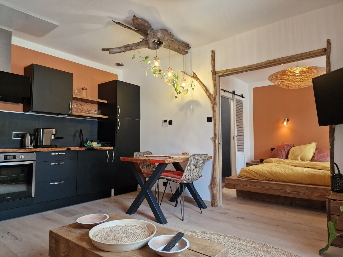 Au coeur de Lanas, charmant petit village ardéchois, venez découvrir notre studio très "cocoon" et atypique, à proximité de l'Ardèche. Le logement est fonctionnel et idéal pour 2 personnes. 😍 De plain pied, il a une entrée indépendante sur une cour fermée (utile si vous avez des vélos)... L'appartement se compose d'un coin cuisine/repas très bien équipé et une chambre séparée, avec 1 lit confort (160×200cm) + 1 sdb/wc. Il est ouvert sur une belle terrasse couverte... pour le farniente🌞😎