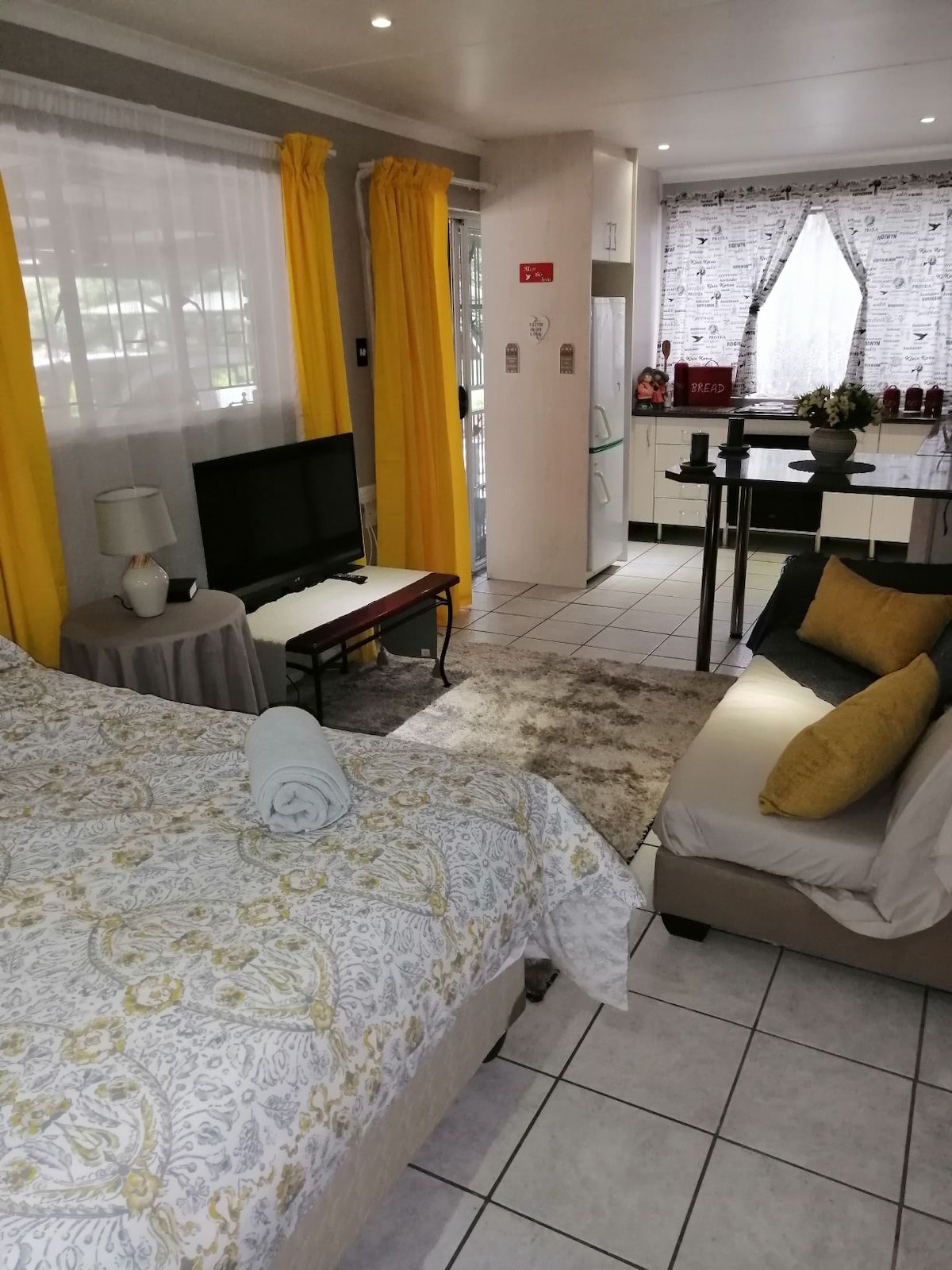 Our room has everything you need, solar electricity, luxury linen with DSTV, Netflix, air conditioning,microwave and fridge(include dishware ) . It is a spacious room where you can relax and it’s perfect for business travelers where they have a friendly work space for their laptops. We also have a security guard who patrol our premises.