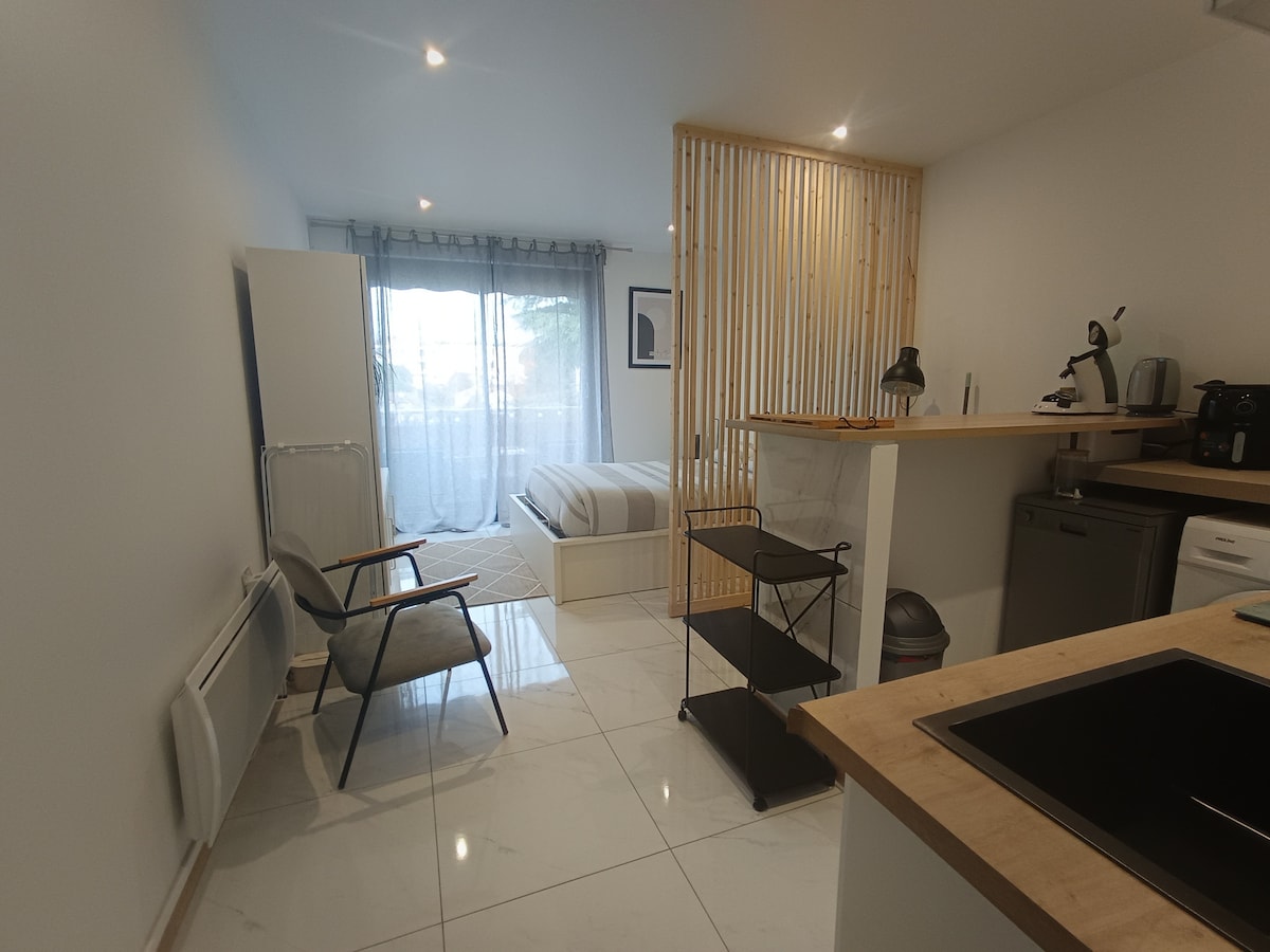 5 km fra Cahors, Bellefont la Rauze, lyst nyt atelier på 38 kvm i fredelig natur. I stueplan i et hus, fuldt udstyret køkken, opvaskemaskine, vaskemaskine (i tilstødende vaskinrum), basismad til at byde dig velkommen under de bedste forhold, tv, fiber-wifi. Egen indgang, privat terrasse, adgang til poolen, smuk udsigt over dalen og mulighed for vandreture fra atelieret. Masser af seværdigheder i området.
