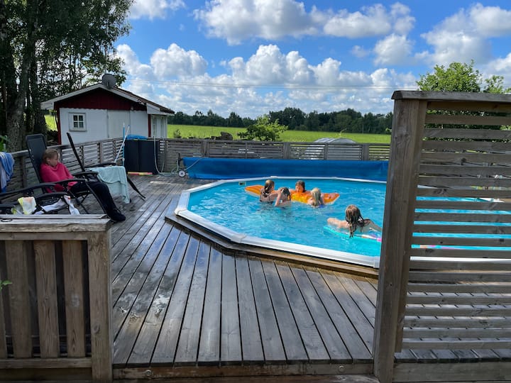 Hyggelig hytte på gård med skov og sportsfiskeri