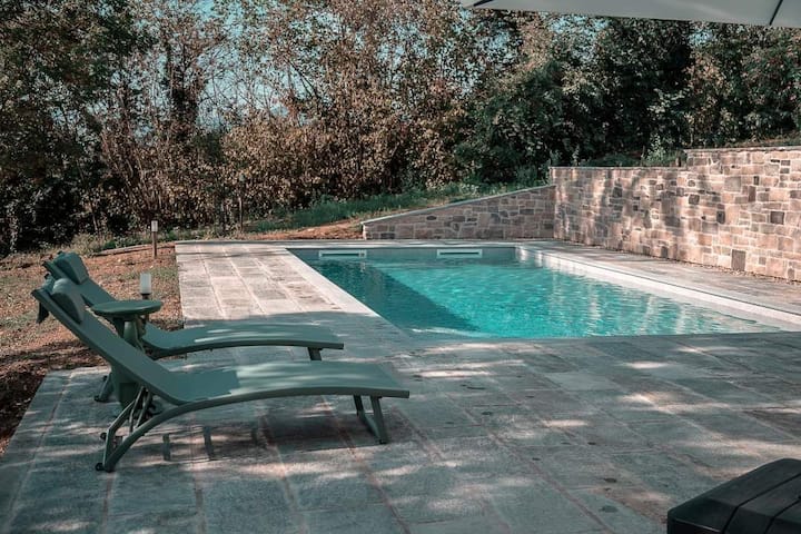 Uafhængigt værelse med veranda med udsigt over landskabet.