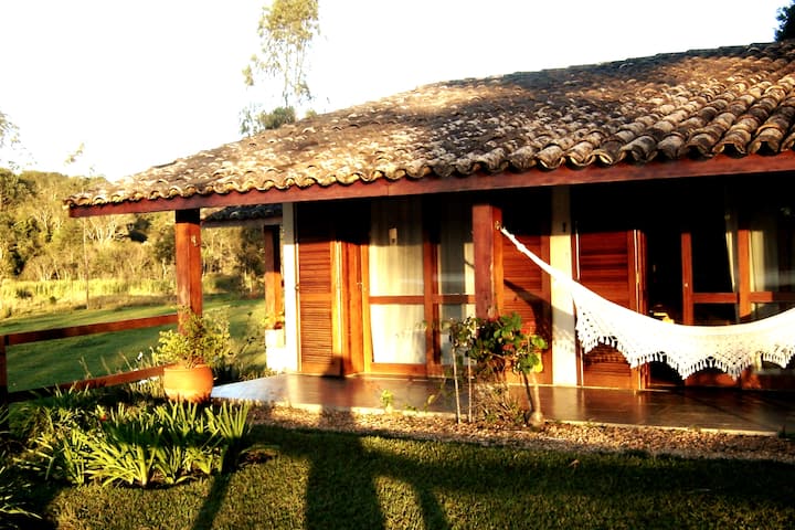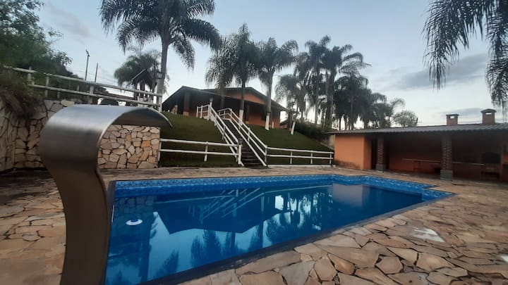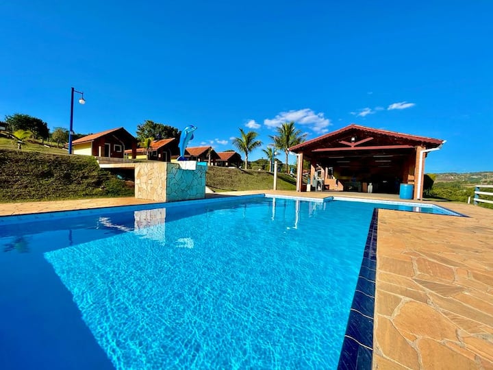 Gård med 4 hytter, stor swimmingpool og masser af grønne områder