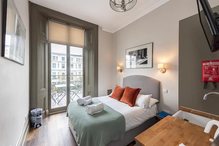 Lyst dobbeltværelse med eget badeværelse i det centrale London