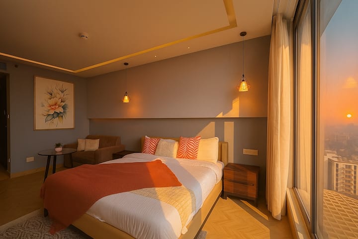Central City Pad med tagterrasse og udsigt over solnedgangen
