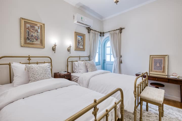 Stilfuldt værelse med 2 enkeltsenge og hyggelig bohemeindretning
