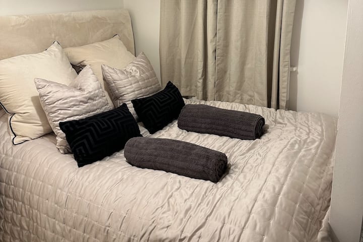 Lykkeligt og hyggeligt soveværelse med tilhørende bruser